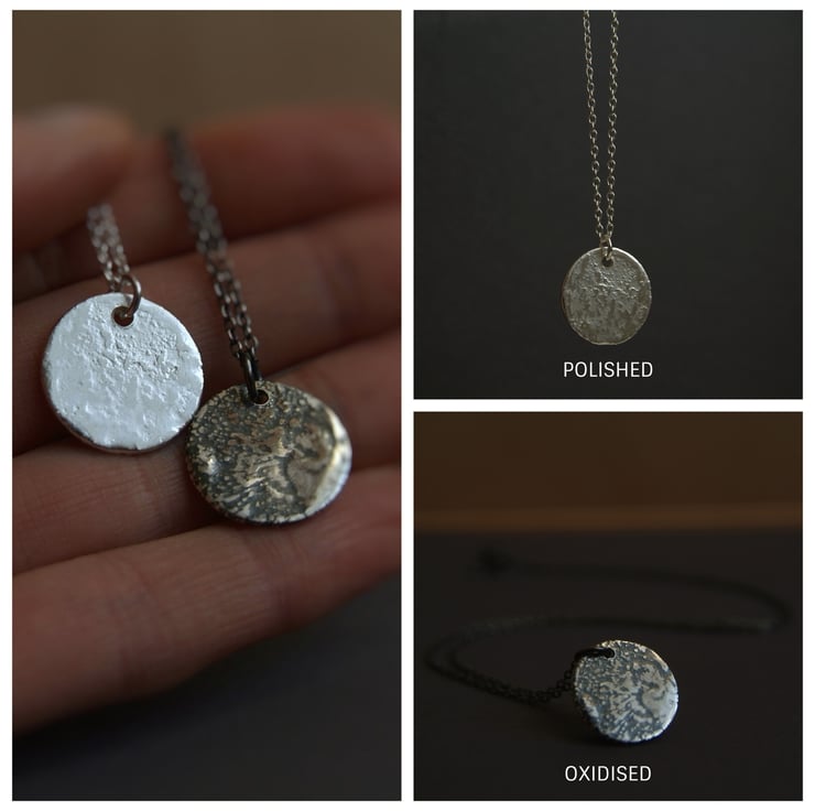 2. Oxidised xxx with a blackened finish and polished highlights on pendant and chain.