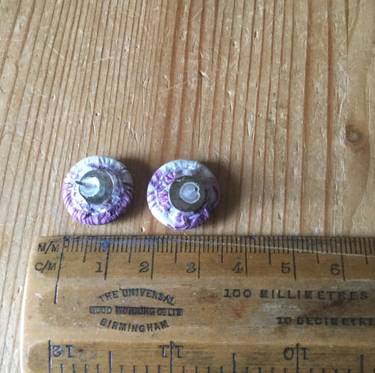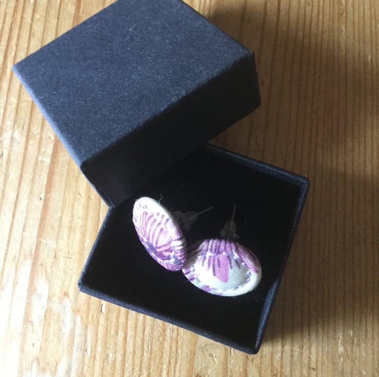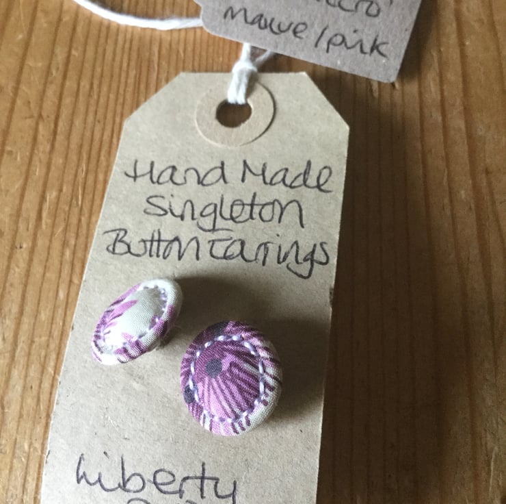 These unique, delicate Dorset button earrings are made from tiny 15 mm Singleton buttons securely fixed to a nickel-free, silver plated earring back. The fabric used is the Liberty print ‘Hiro’ in shades of mauve and pink, hand stitched with matching thread. They are very light and easy to wear.