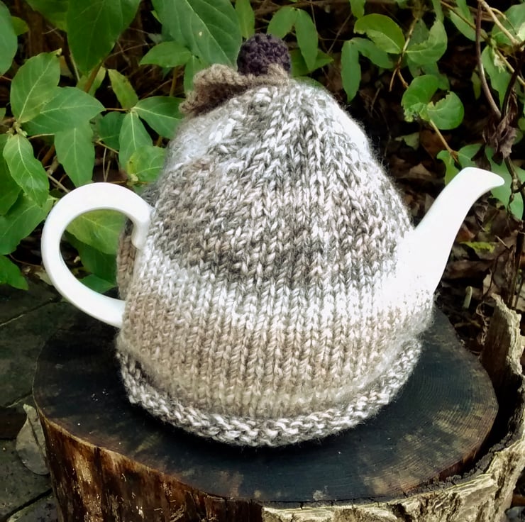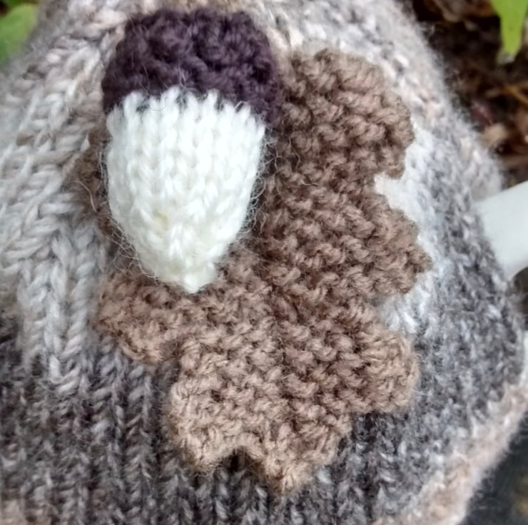 I have designed a new tea cosy using my autumn acorn theme. I have hand knitted this cosy and attached a knitted oak leaf and acorn on the top. Using a lovely chunky marbled yarn in shades of brown, beige, grey and cream. I find that the tea cosy is thick enough to keep my teapot lovely and hot. It will fit a standard 4-6 cup teapot and is fairly stretchy, so will fit many different designs of teapot.