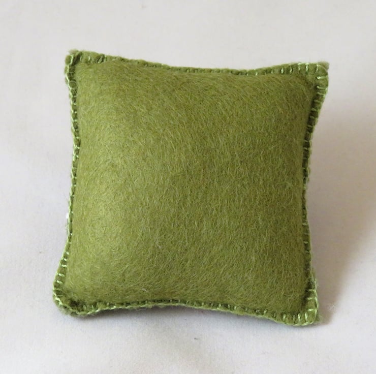 The back of the pincushion is grey eco felt. The pincushion is blanket-stitched together using green thread and is gently stuffed with polyester filling.