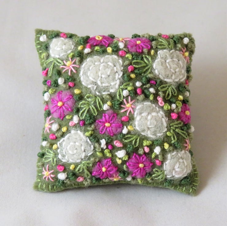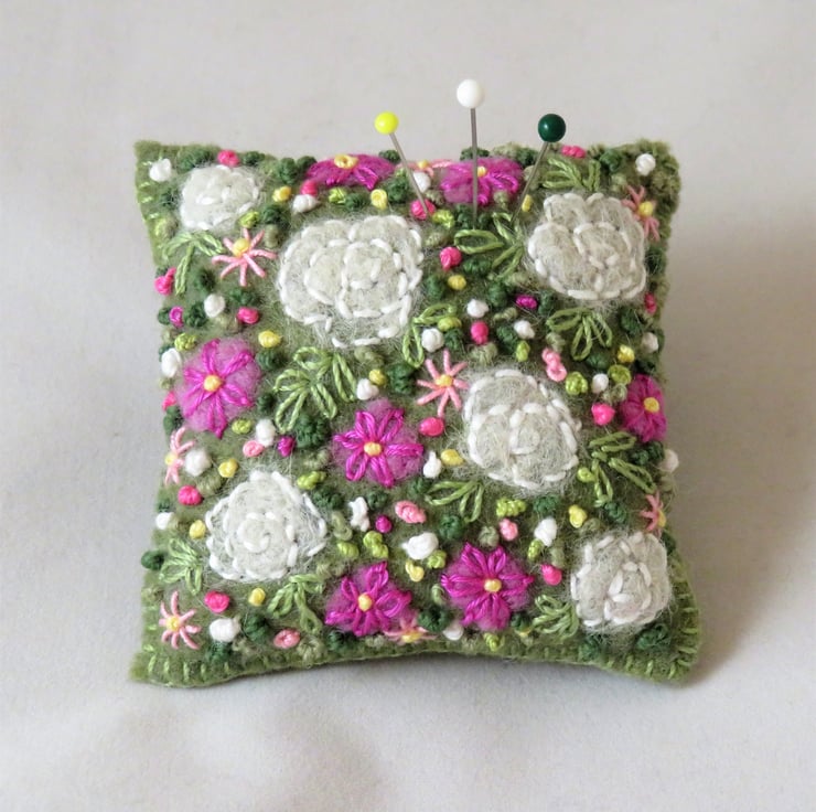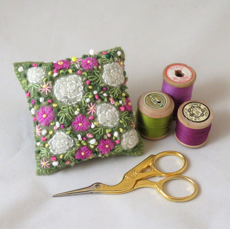 A very pretty pincushion, featuring a medley of roses, anemones and daisies, embroidered in shades of pink and white.