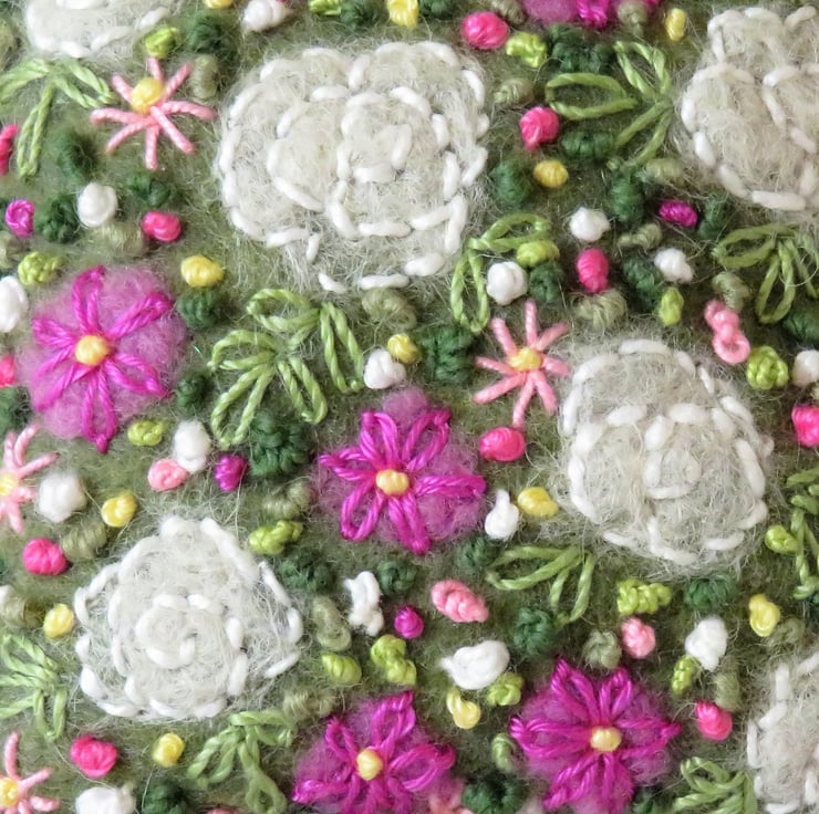 White and pink roses have been needle-felted onto a green felt background. Using simple embroidery stitches, details of the rose petals have been added and daisies, flower buds and foliage have been stitched to complete the design.