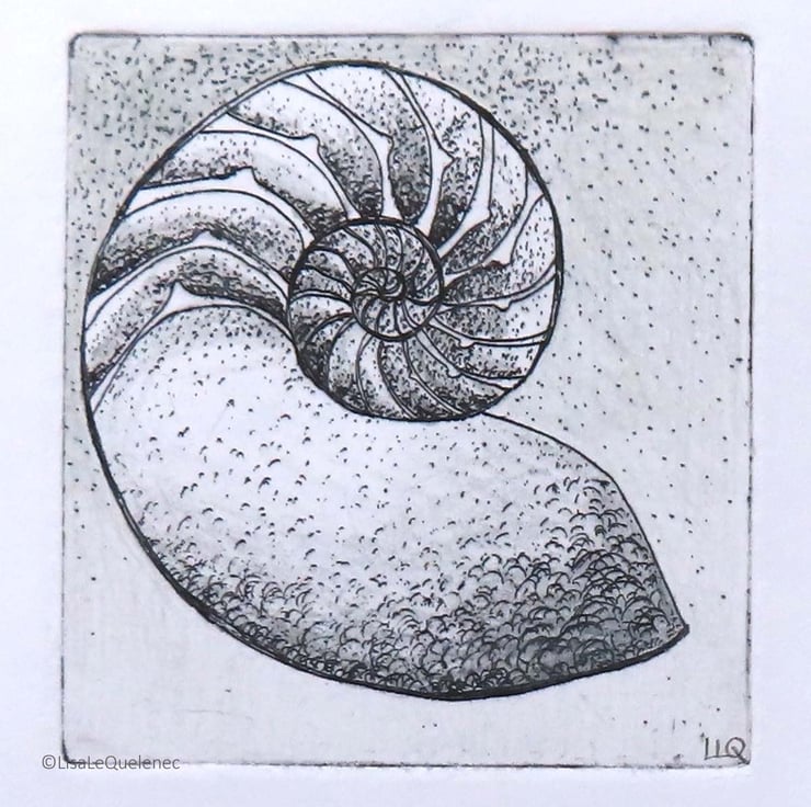 Chambered nautilus etching and mixed media art work