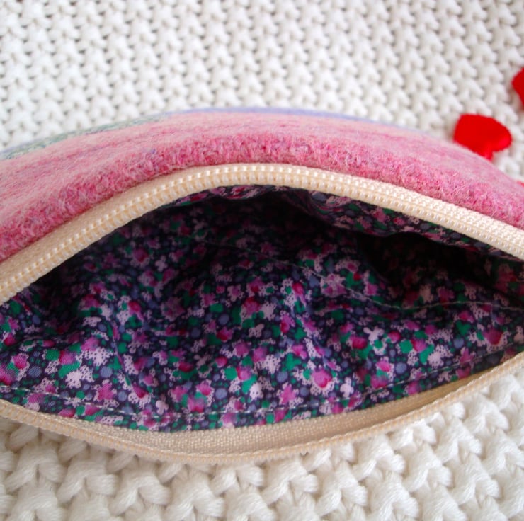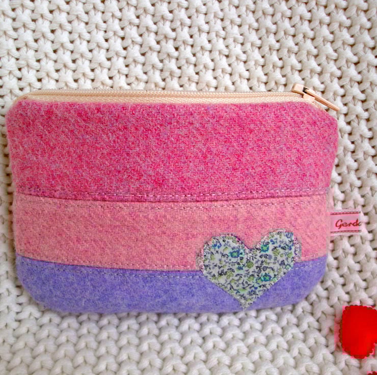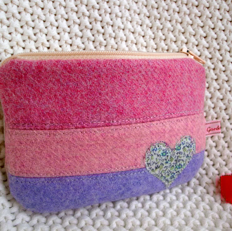 Front is made in 3 lovely pastel tweed fabrics , and embellished with a cute heart made in a Liberty cotton fabric