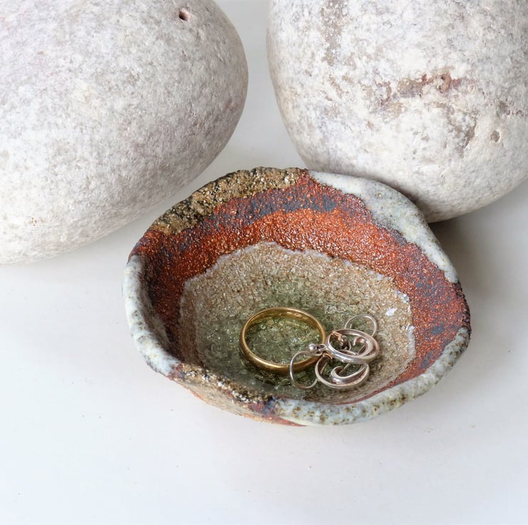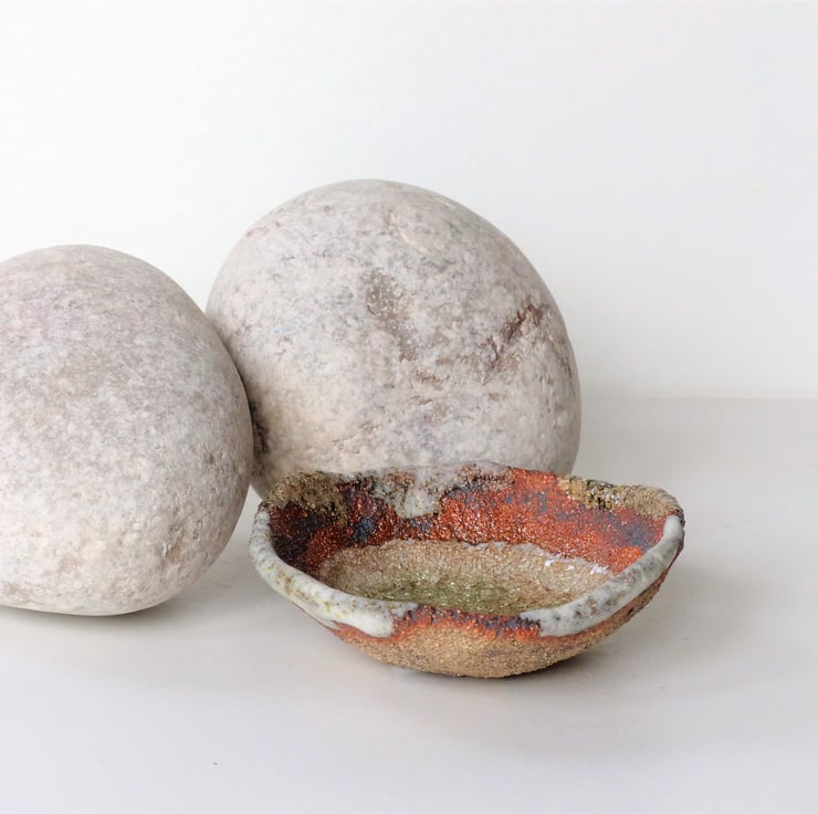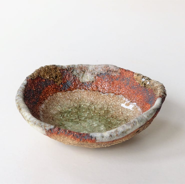 A handmade stoneware ceramic bowl with a beautiful gentle pool of melted glass in the centre.