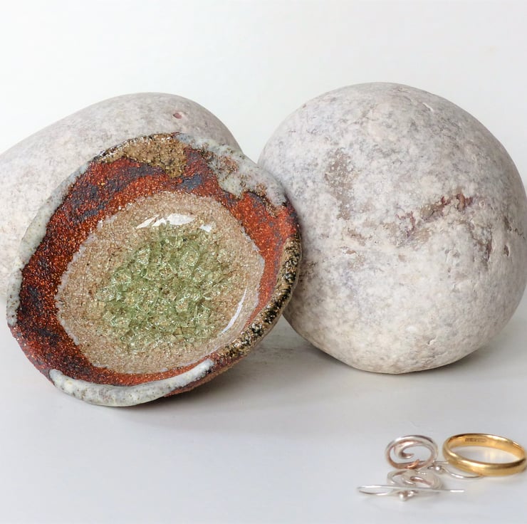 When I first discovered melted glass in ceramics I loved the contrast of the rough matt fired clay and feminine aura of the glass. I wanted to combine the two in a mature way to make a piece of peaceful beauty. They remind me of rock pools at the beach, pools of spring water, - life.