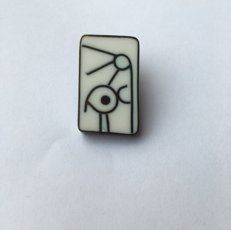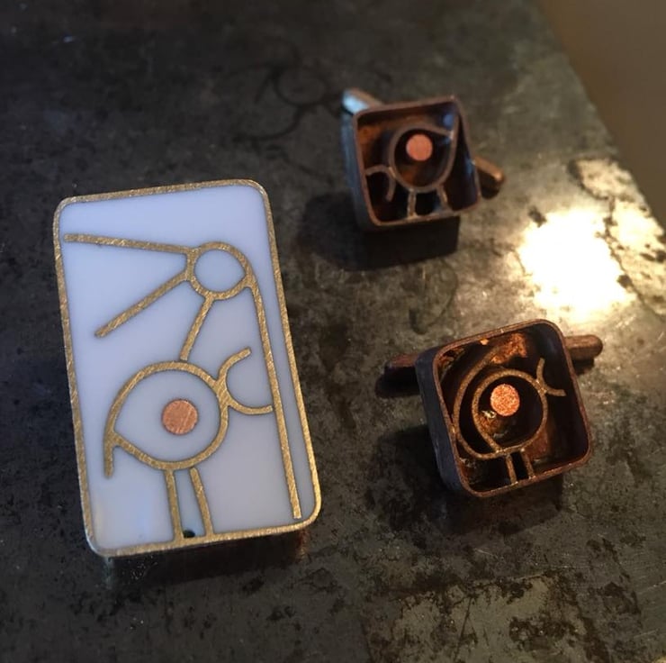 It is made in brass using handcut strips of metal (I've included a work in progress photo in the gallery) these are then formed and soldered individually onto a base, then each section is filled with hand mixed resin that is polished to a shiny finish.