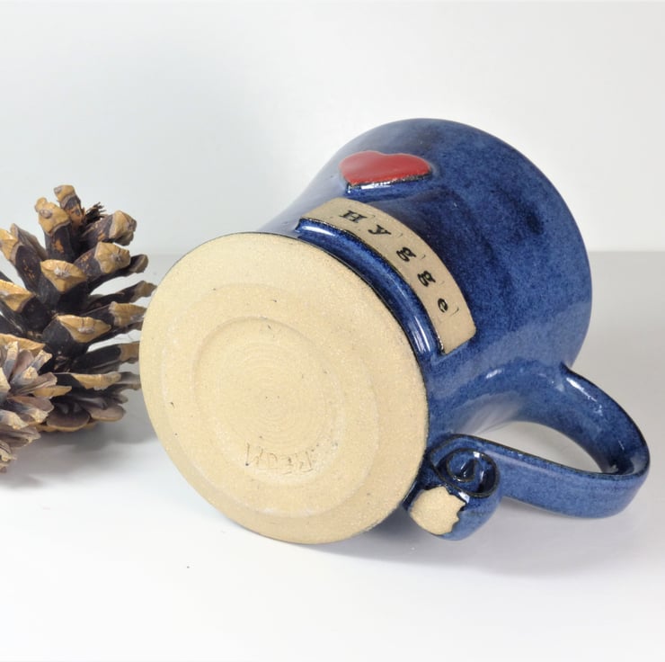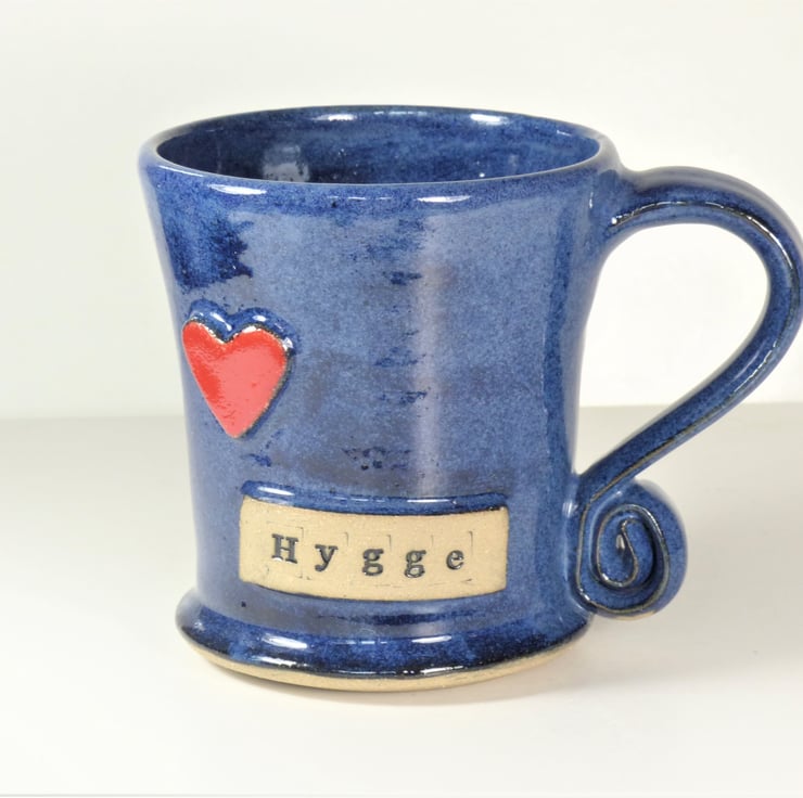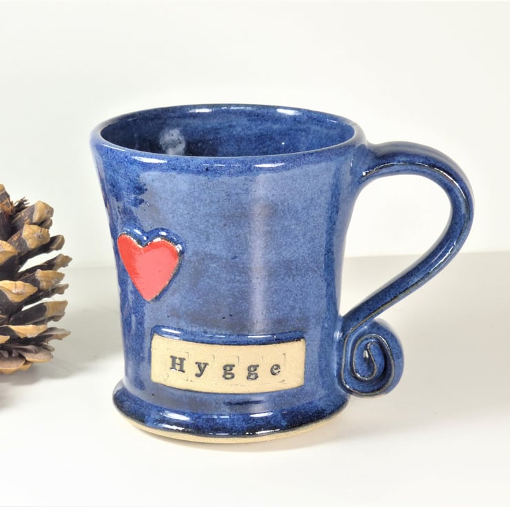 This gorgeous blue mug has the words 'Hygge' stamped into raised clay on the side of the mug. It also has a big red heart.
