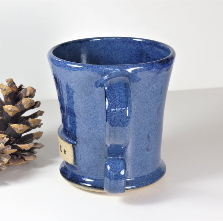I threw this mug on the potter's wheel using a buff stoneware clay. I then turned the base and added the handle and decoration before bisque firing the mug. I glazed it using a lovely rich glaze and refired to 1240C stoneware making it strong and durable.