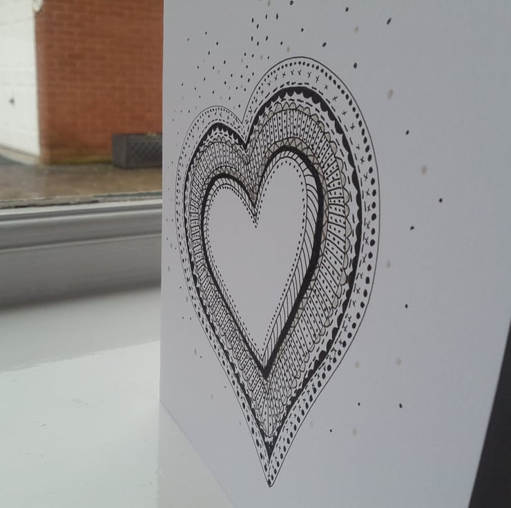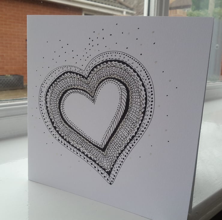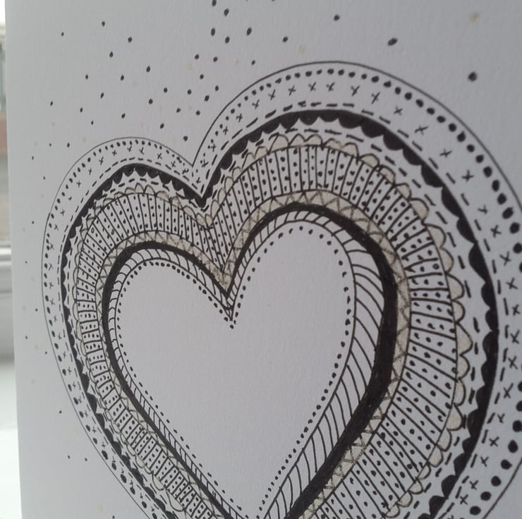 A completely handmade and uniquely designed card. Consisting of a heart hand drawn in pen and ink onto quality pristine white card. Lots of patterns embellish the heart and highlit in silver.