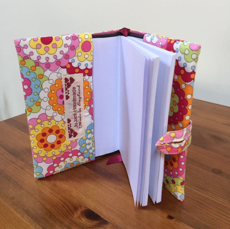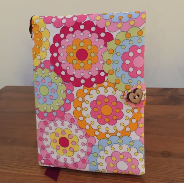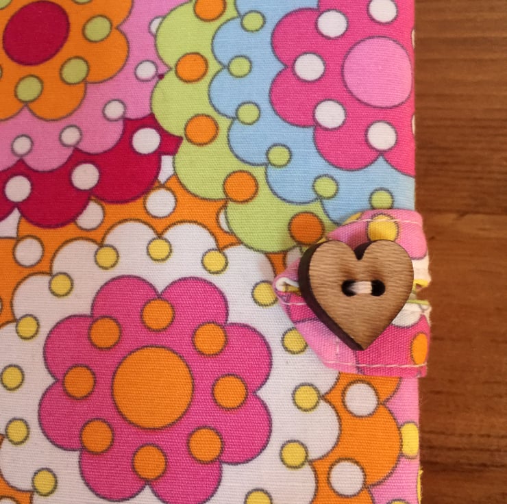 This fabric covered notebook has been made from a funky flower print fabric and lined with a contrasting cotton.It has a fabric and wooden heart button closure and a silk ribbon bookmark.A 'made with love' gold coloured charm has been added to the outside cover for decoration.