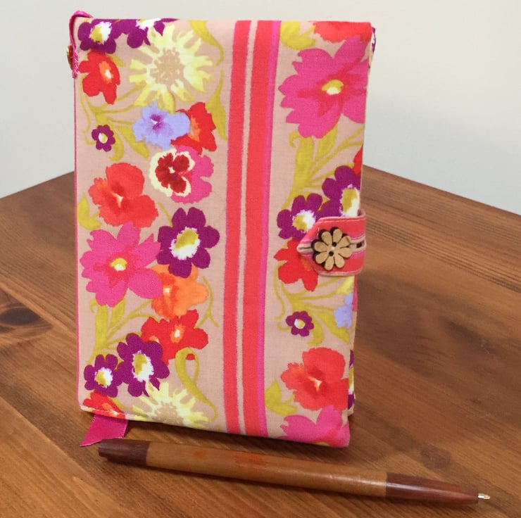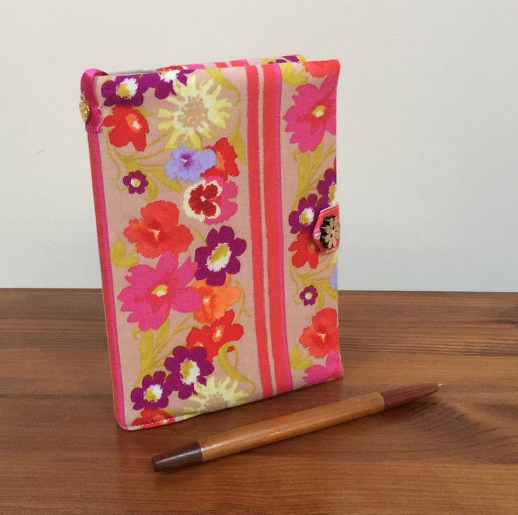 This fabric covered notebook has been made from a vibrant pansy print and lined with a contrasting cotton fabric.It has a fabric and wooden daisy button closure and a satin ribbon bookmark.A 'made with love' gold coloured charm has been added to the outside cover for decoration.