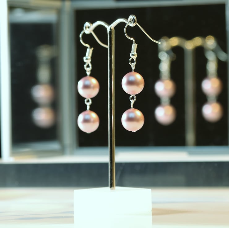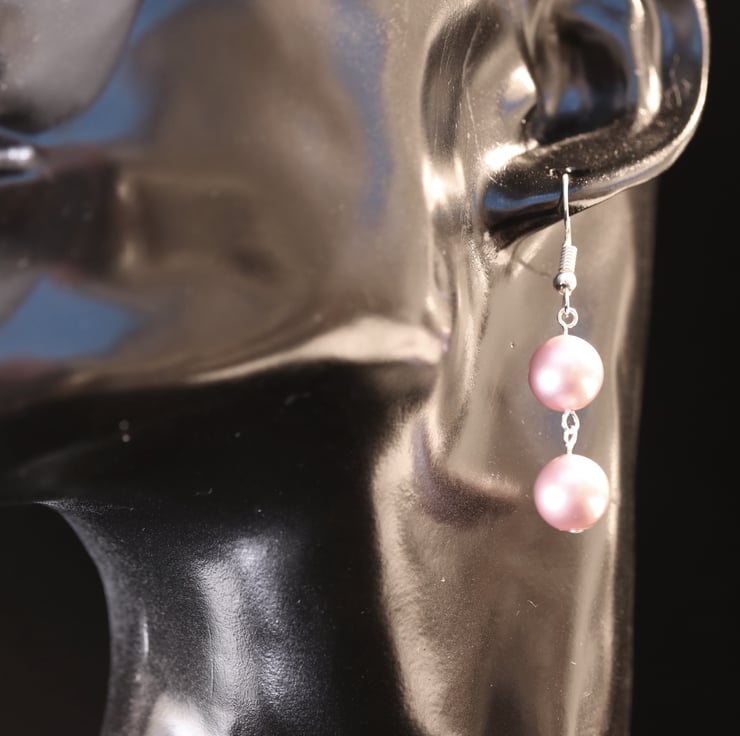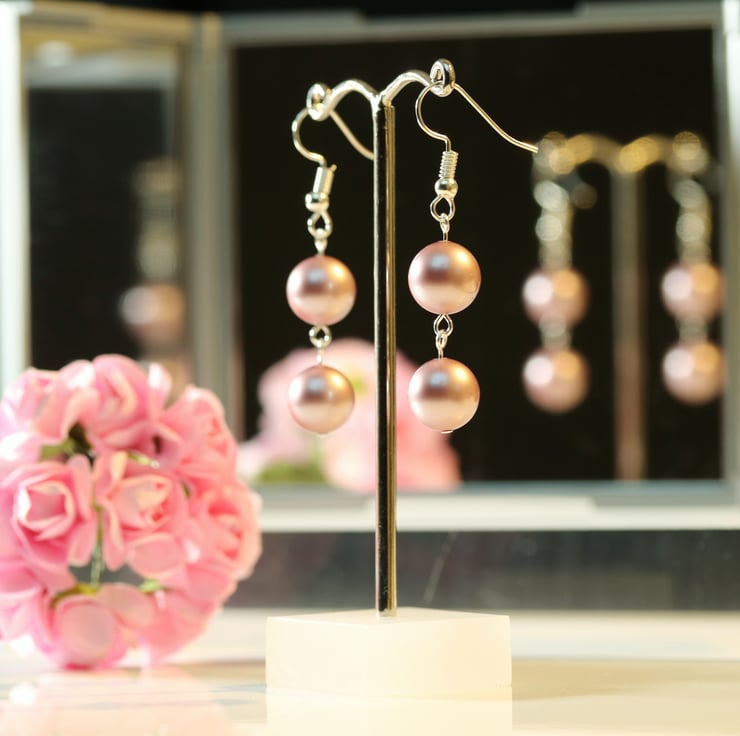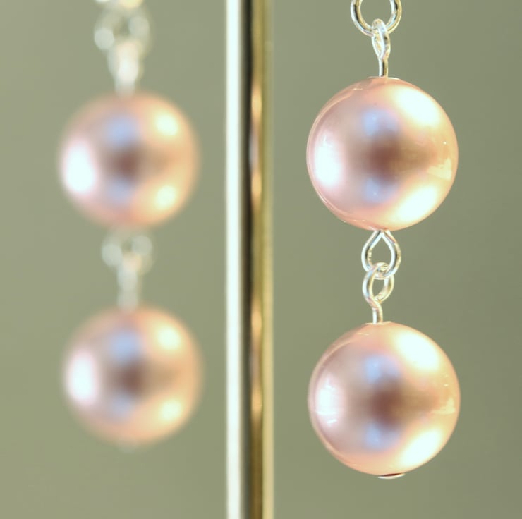 These earrings are each made from two delicately coloured pale pink 10mm Swarovski crystal pearls. The colour is called Powder Rose by Swarovski. They are linked with silver plated pins and hang from silver plated hooks.