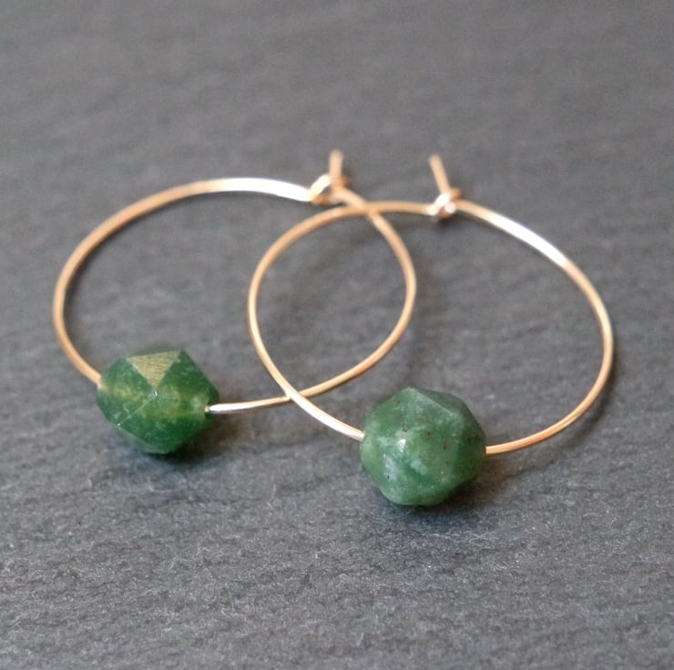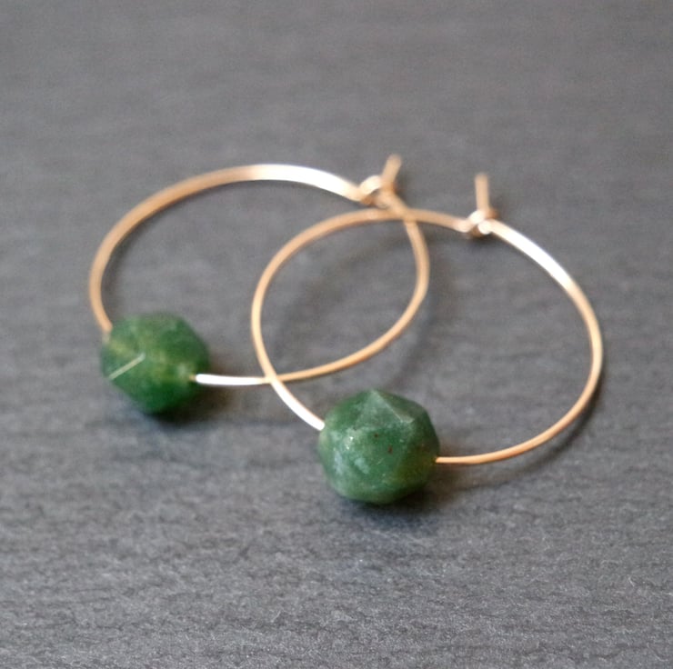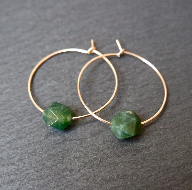A pair of 14k gold filled hoops with beautiful natural moss agate beads that are faceted, which give them a very geometric look.
