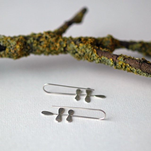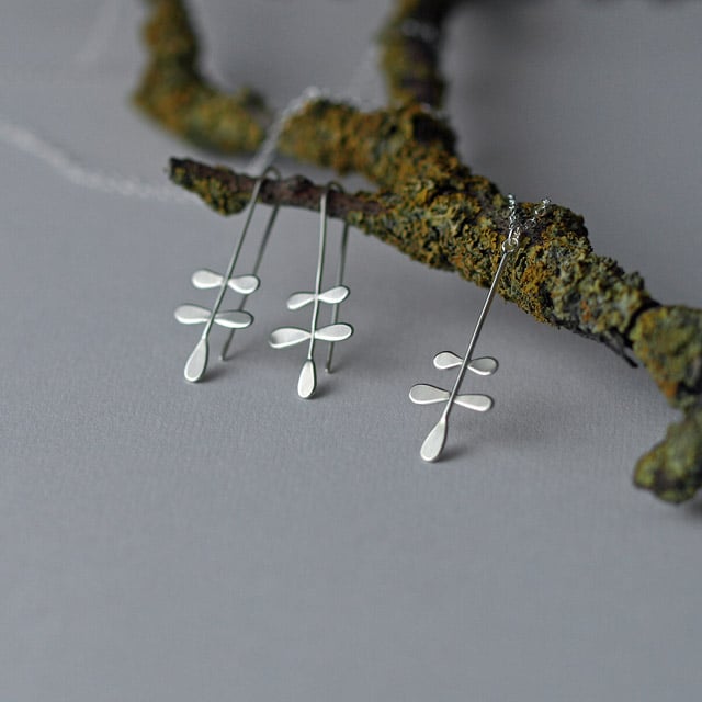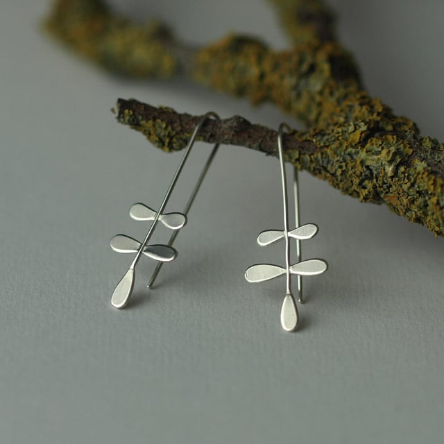 Small leaf shapes are cut from recycled sterling silver and soldered onto recycled sterling silver wire to create a fern inspired form. The long wire is then bent and shaped to create earring threaders.