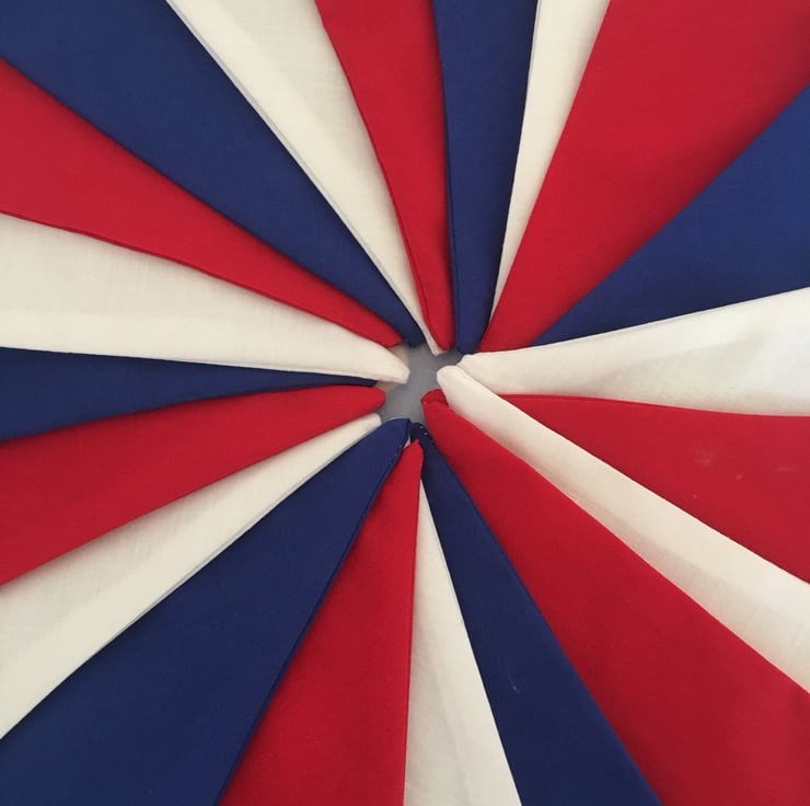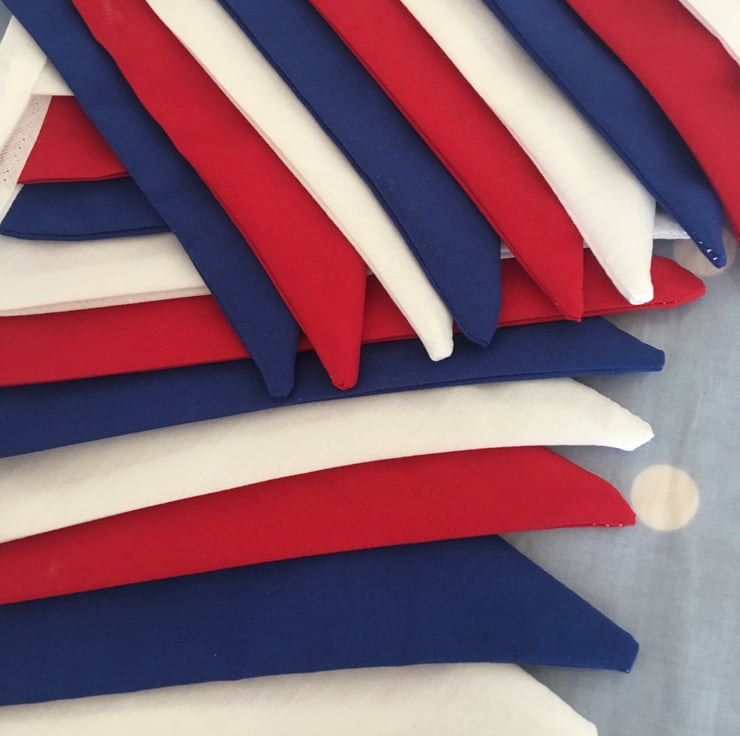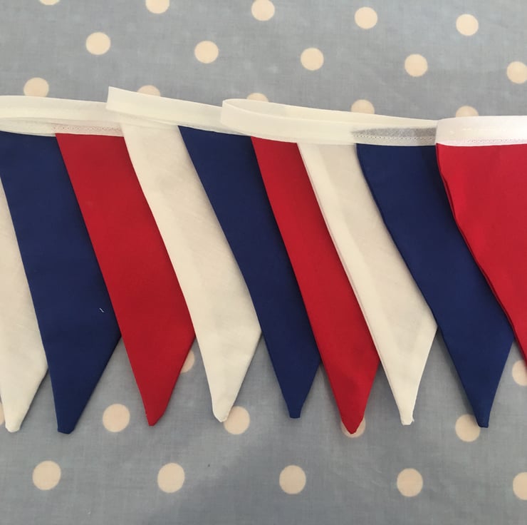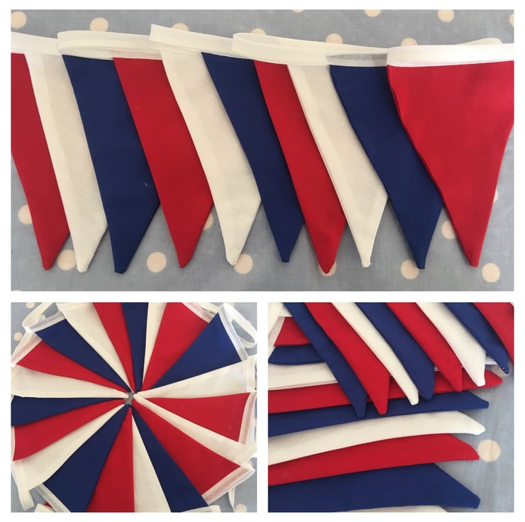 Decorate your home or street party with this patriotic bunting made with cotton fabrics, each flag is 7" tall and then attached to white bias binding
