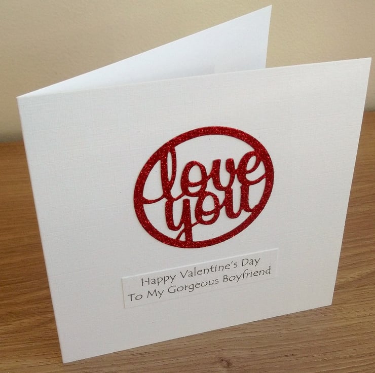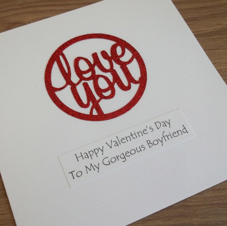 A clean and simple Valentine's card. A die cut in red glitter card reading "love you" along with a message which can be personalised to say anything you would like. Leave details as you order..