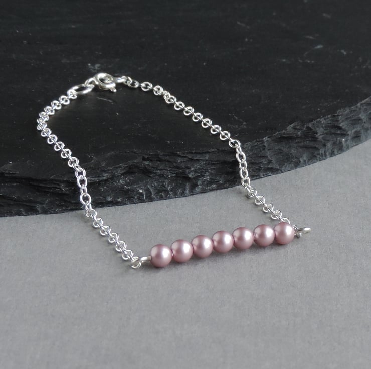 Dainty Dusky Pink Glass Pearl Bar Bracelet - Powder Rose Layering Bracelets