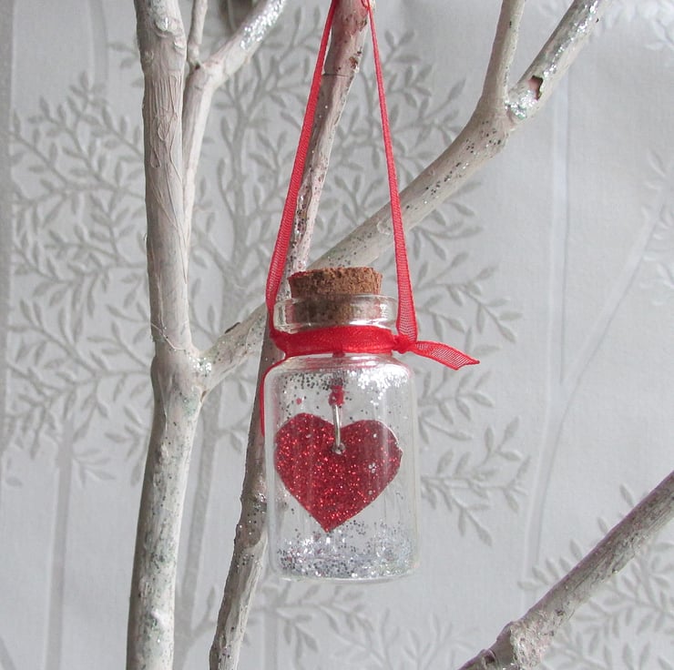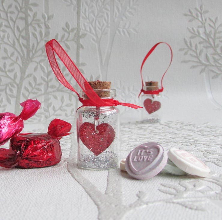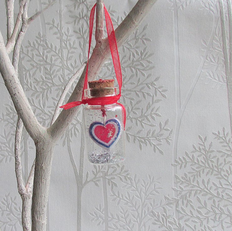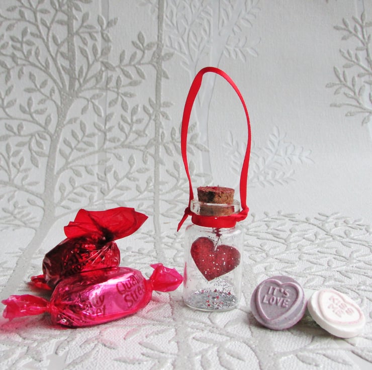 This little Valentine Bottle is filled with a glittery Love Heart, finished off with a nice red ribbon. One side of the Heart is Red glittery the back is a Red, White & Blue Heart.