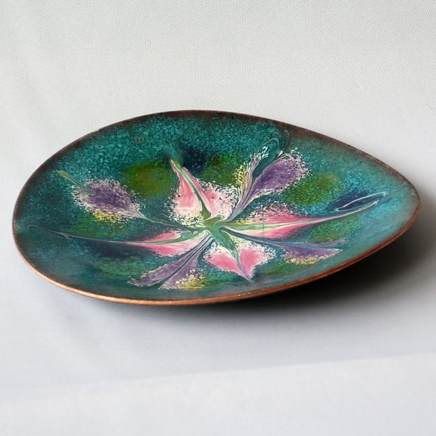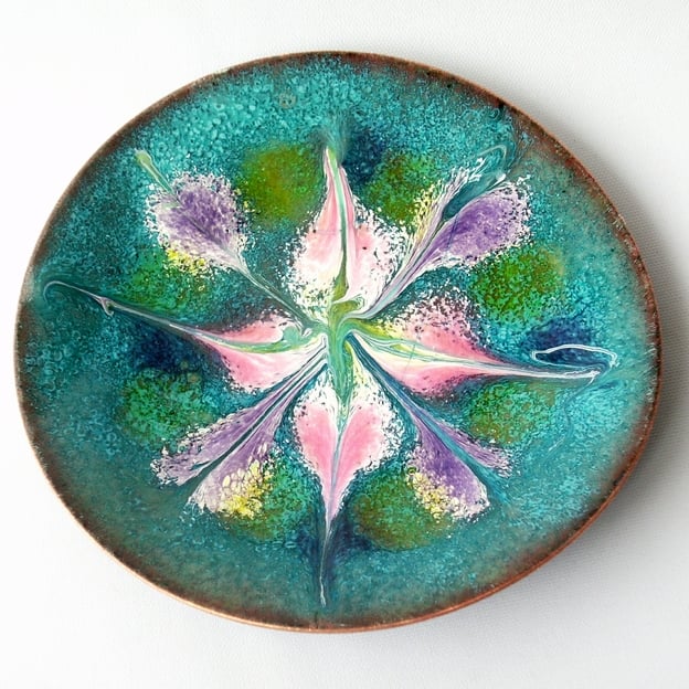 To make this dish I built up several layers of clear enamel on the copper shape. I then fired a layer of turquoise enamel over the clear. In some lights the copper beneath may glimmer in tones of golden brown through the clear and the turquoise layers. I then added scattered piles of white enamel over which I sprinkled pink, purple, and gold transparent enamel. Transparent enamels show their colour when they are fired over white enamel. Where the gold and the purple enamel is not over white they have added a green and a blue tint to the turquoise. When the dish was in the kiln, at red hot I drew through the surface with a steel point to generate the pattern. It is a more contrived pattern than you see on much of my work but still has its random elements and is certainly unique.