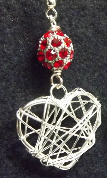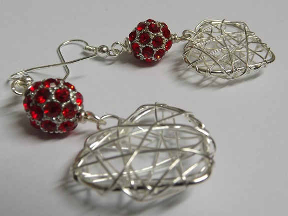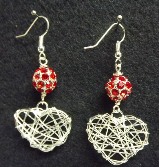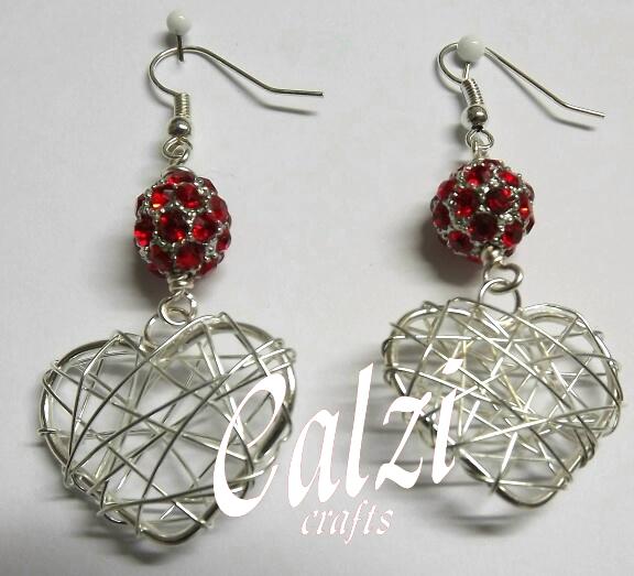 For these dangle earrings I have paired large wire wrapped silver plated hearts with sparkly red crystal studded beads. The hearts are 2.5cm x 2cm, the earrings are approx 6cm/just over 2" long inc the silver plated earhooks.
