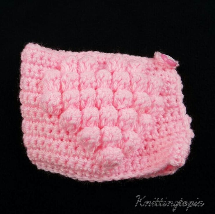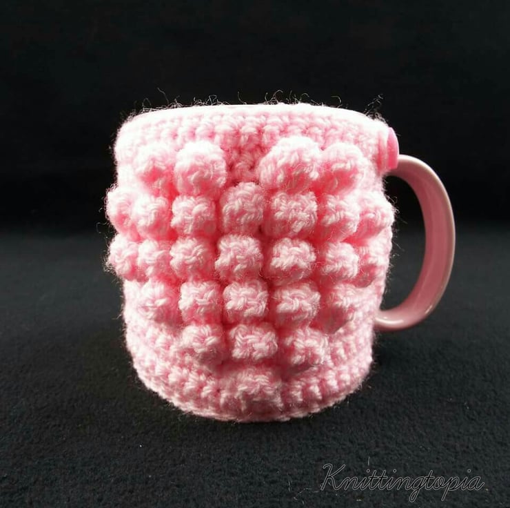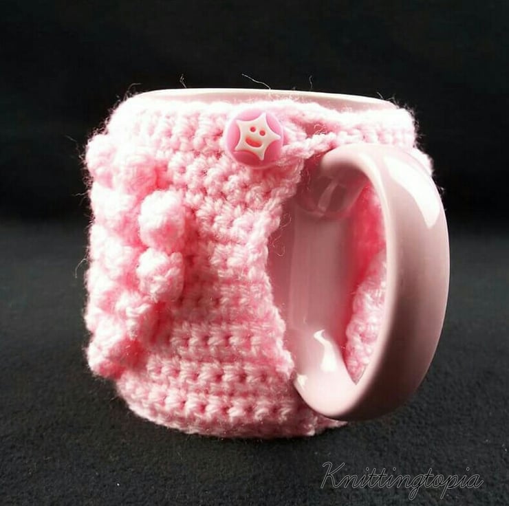Pink mug cosy with textured bobble hearts on either side. It has a crocheted loop which fits over the mug handle and fastens around a button. This would make a great gift for Valentine's Day or Mother's Day.