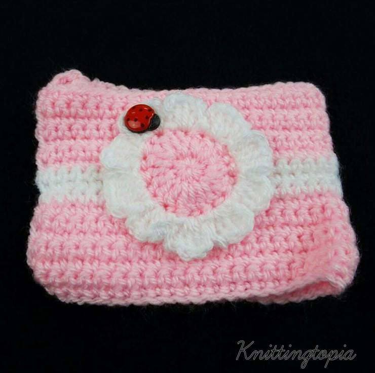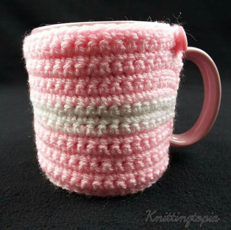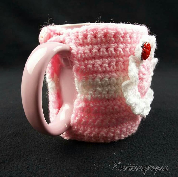 Crocheted in baby pink and white yarn, this beautiful mug cosy is just what you need to keep your cuppa warm. It also helps to stop you burning your hands too! It is mainly in pink with a white band around the middle and has a crocheted flower applique on the front. The flower is pink in the middle with white petals and has a ladybug or ladybird button sewn onto one of the petals for a finishing touch. It has a crocheted loop which fits over the mug handle and fastens around a button. This would make a great gift for Mother's Day.