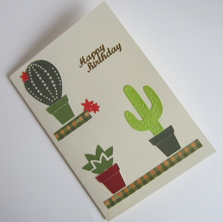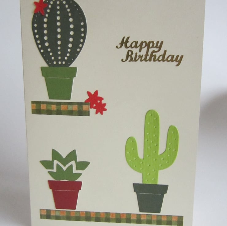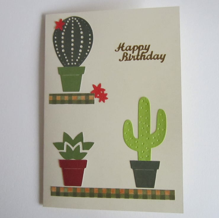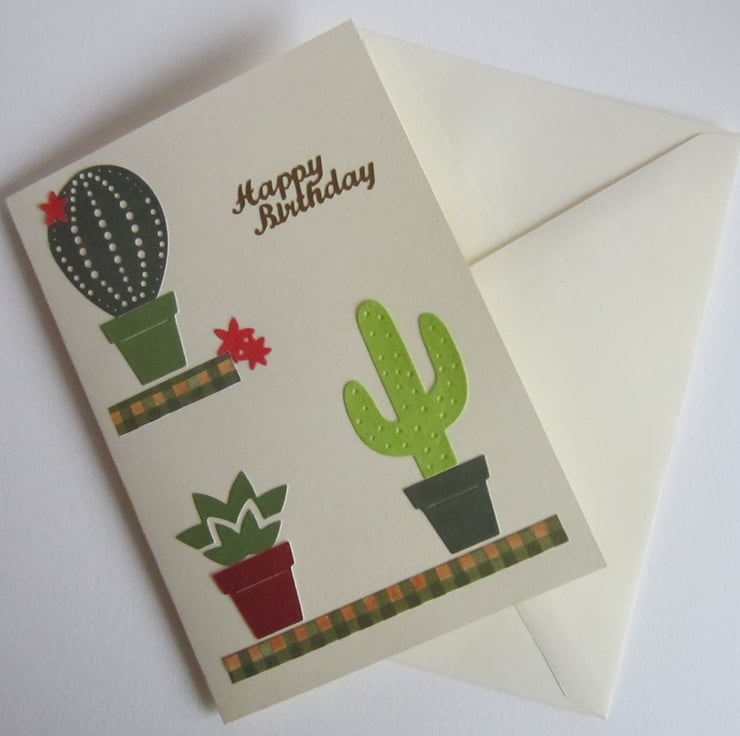 Happy Birthday greetings card handmade from card die cuts of different species of cacti on a cream background.