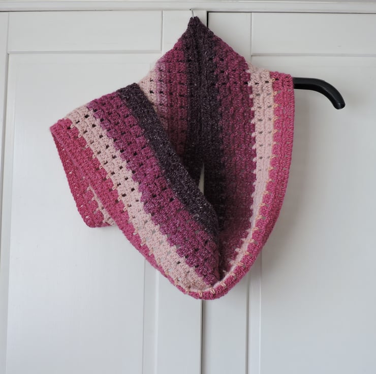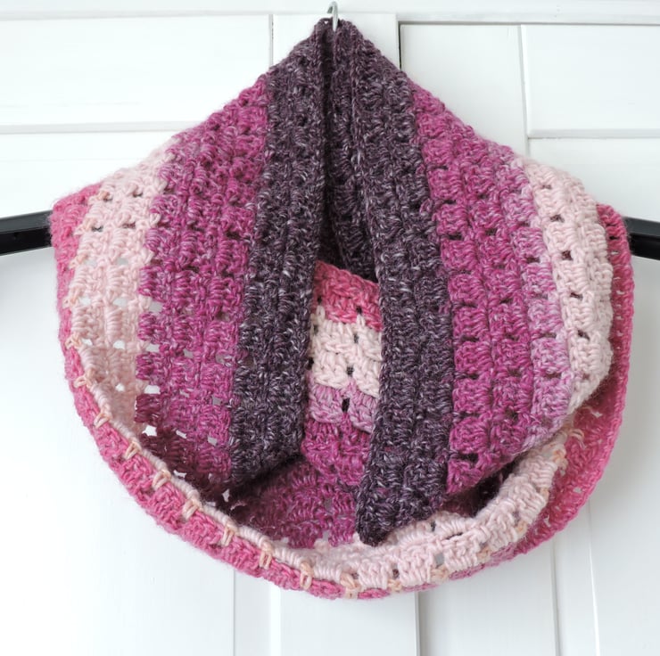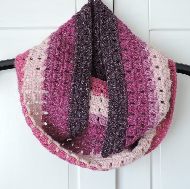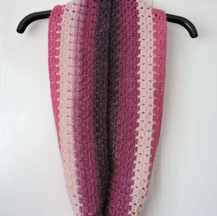 For this colourful crochet infinity scarf I've used a double knit premium acrylic graduated yarn. This yarn graduates through raspberry, blackberry, rose pink and pale pink