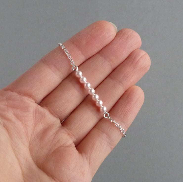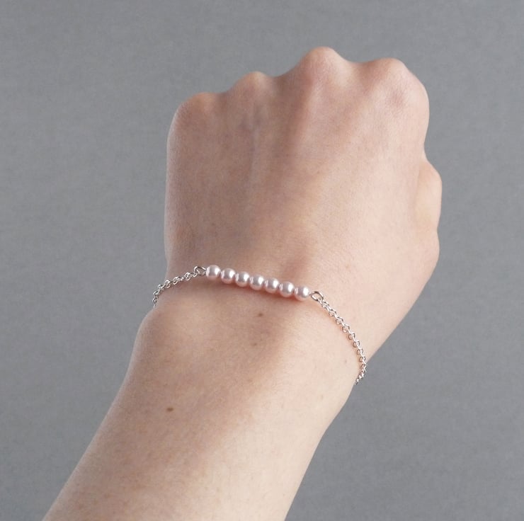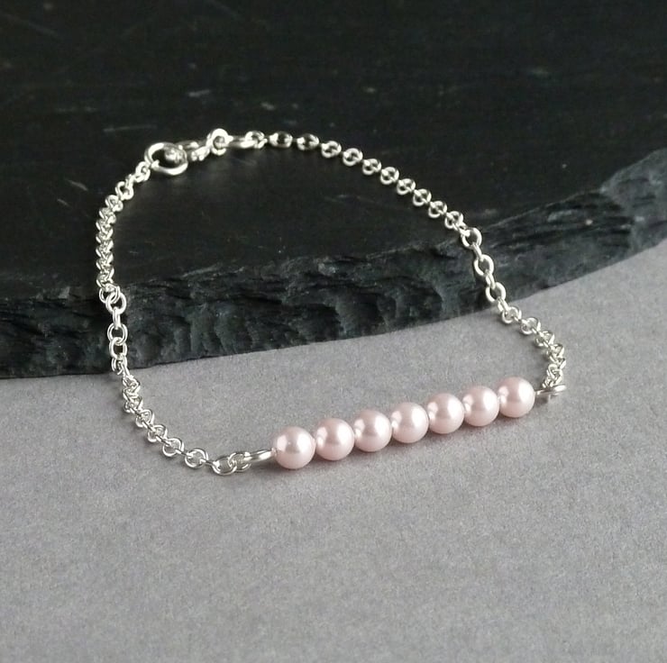 These blush pink layering bracelets pair glass pearls with fine sections of Sterling silver chain. These pale pink, pearl bar bracelets make the ideal gift for bridesmaids and add that finishing touch to a bridal outfit.