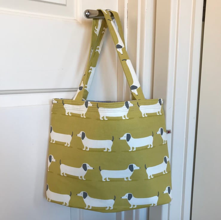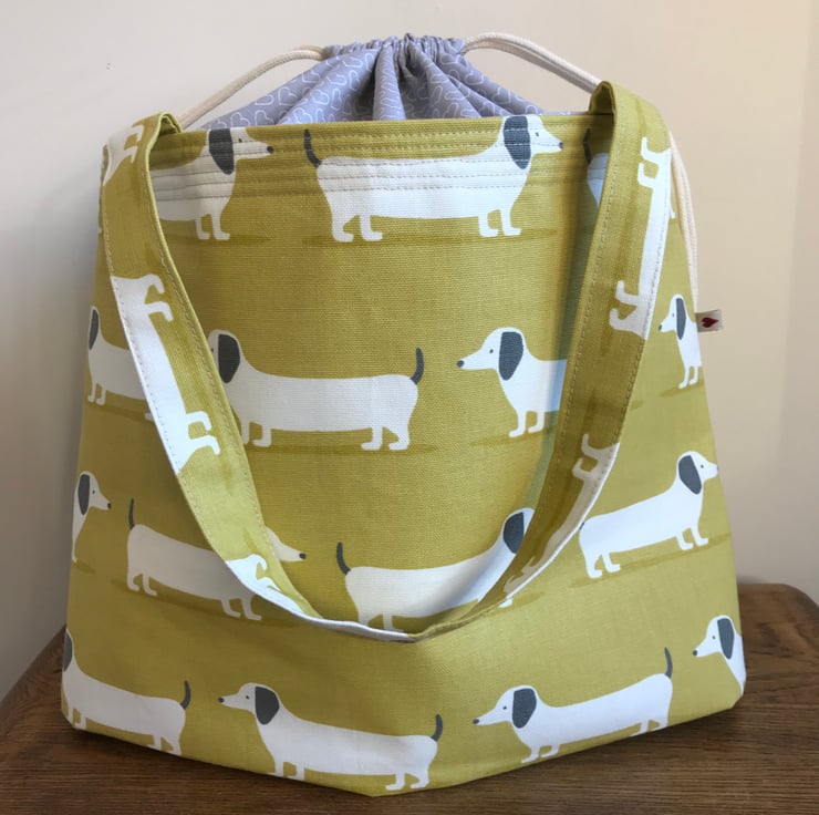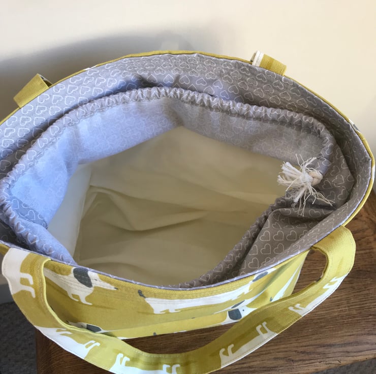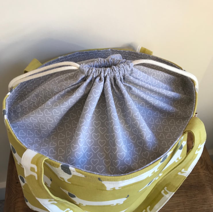 It is made from a cute sausage dog fabric in yellow, grey and white. It is fully lined in cream. Interfacing between the layers gives it body. The drawstring cover is a contrasting grey and white heart print cotton.