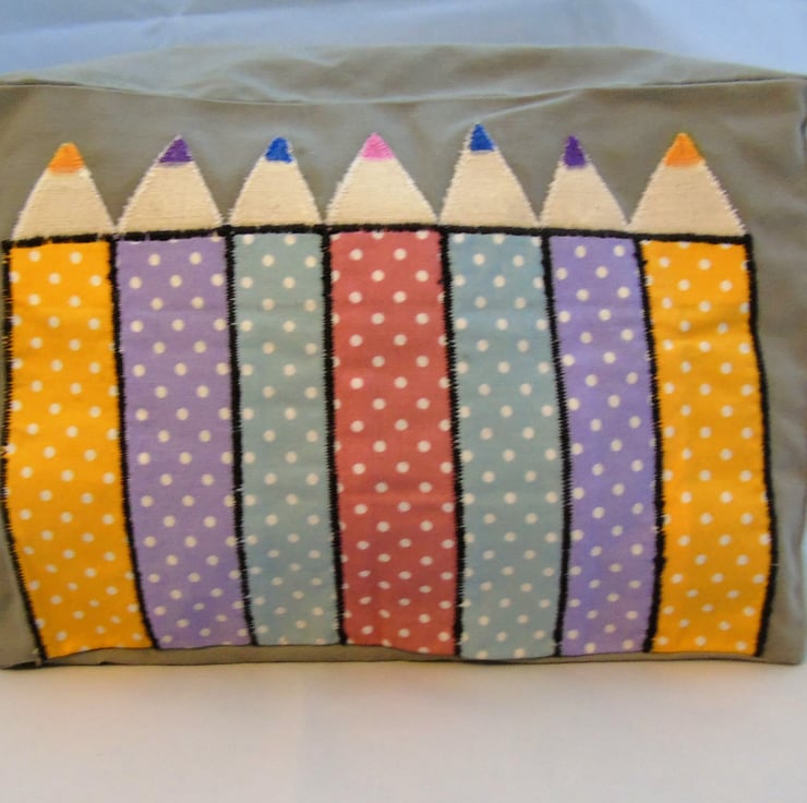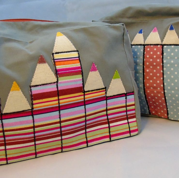 Each case is fully lined with soft grey fabric and features appliquéd pencil designs, carefully stitched for a unique, handcrafted touch. Choose from playful dotty pencils or vibrant stripey pencils—whichever suits your style best!