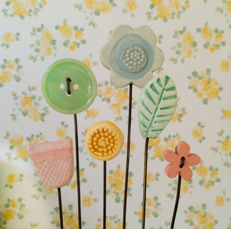 There are two little button flowers, a leaf and three flowers handmade from polymer clay. This is moulded and patterned, fired and hand painted to finish.