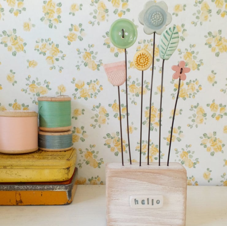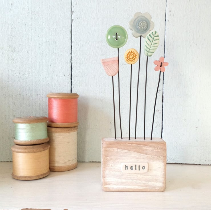 Button and clay flowers and a little leaf grow in this flower garden, standing on their wire stalks in a painted oak wood block.