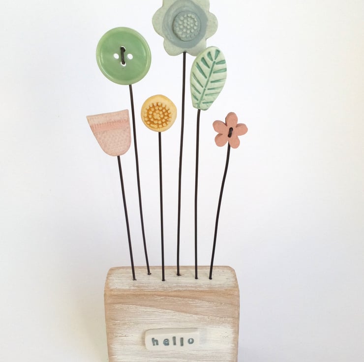 The little clay sign on the front has been hand stamped with the word 'hello' and watches over the sunny flowers.