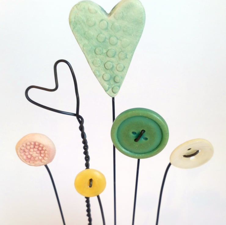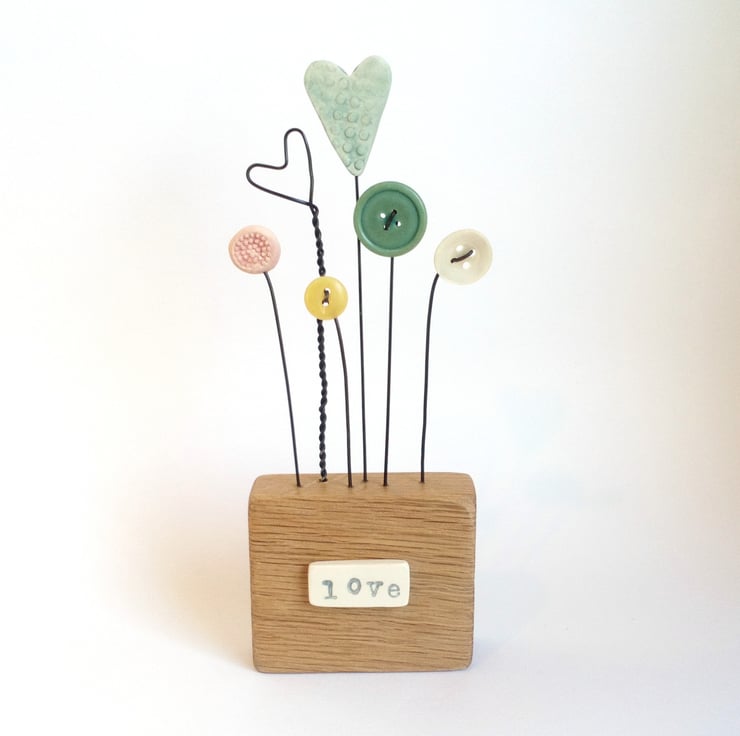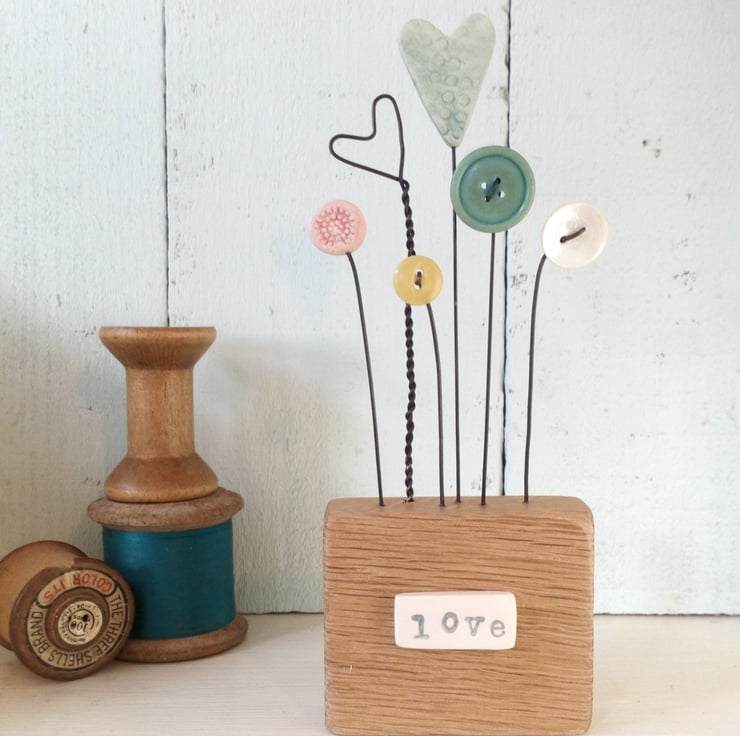 Button and clay flowers and hearts grow in this flower garden, standing on their wire stalks in a wax finished oak wood block.