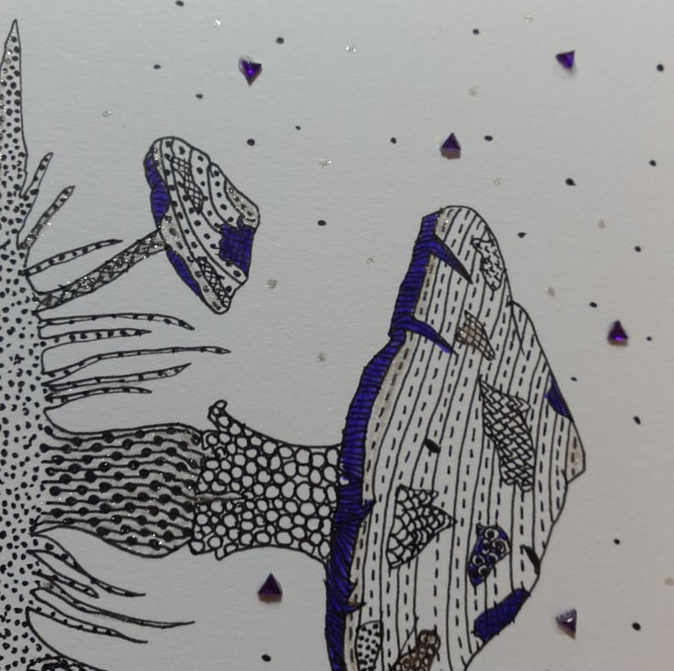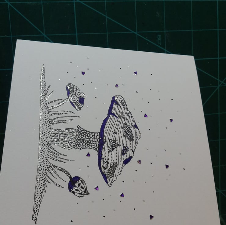 A completely handmade and uniquely designed card. Consisting of a trip of mushrooms hand drawn in pen and ink onto quality pristine white card. The design has been highlit in silver and purple. Finished off with tiny triangle purple beads