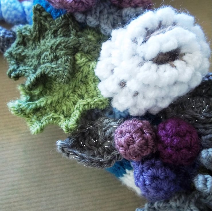 I greatly enjoy crocheting and was looking to branch out in to a larger project the result was getting in to making crochet wreaths. The individual elements means I can work on them anywhere and it’s so rewarding to see all the parts come together in the finished design. Thanks goes to another crochets Lucy and her attic24 blog and her inspirational designs.