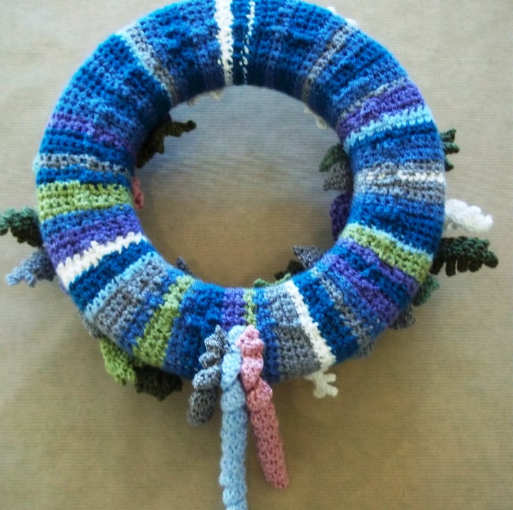 Bring the beauty of frosty days in to your home with the crochet wreath. An individual and unique addition to your winter/Christmas decoration. The 25cm (approximately 10inches) polystyrene wreath base is covered with a striped crocheted cover and the design is created using an profusion of seasonal elements including holly leaves, ferns, berries, pine-cones, hellebore flowers topped off with snowflakes. Made up in blues, purples, greens, sliver greys and whites to evoke a wonderful frosty feel whist having a lovely soft texture, some soft curls finish off the design. All elements are crocheted by me and hand stitched to the base.