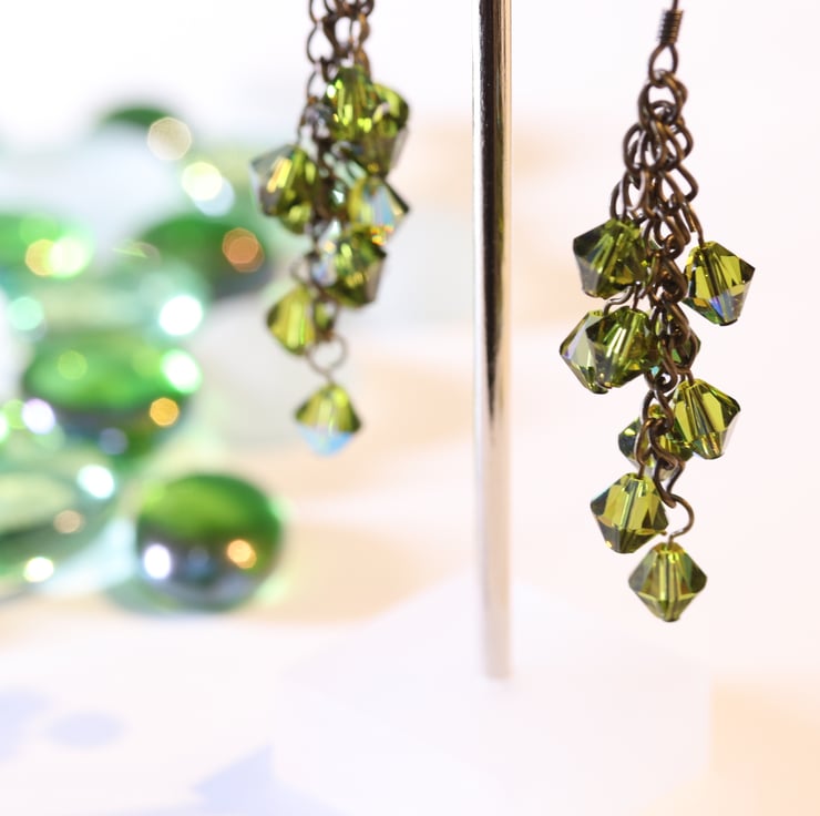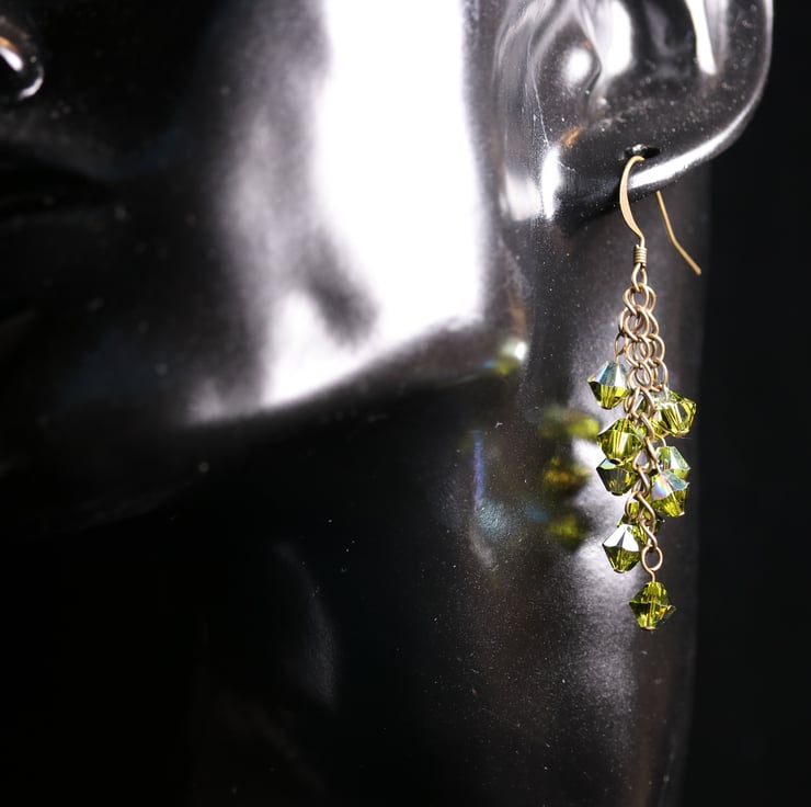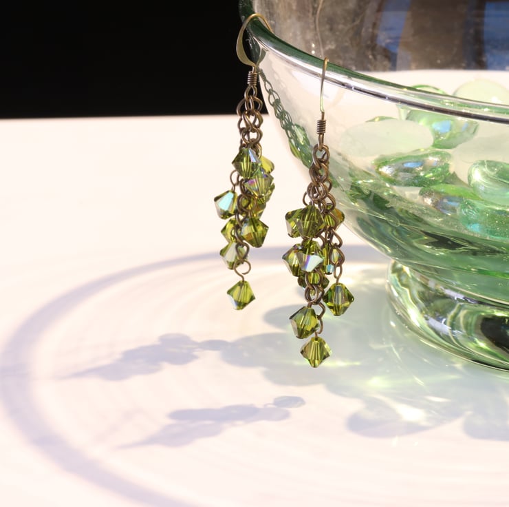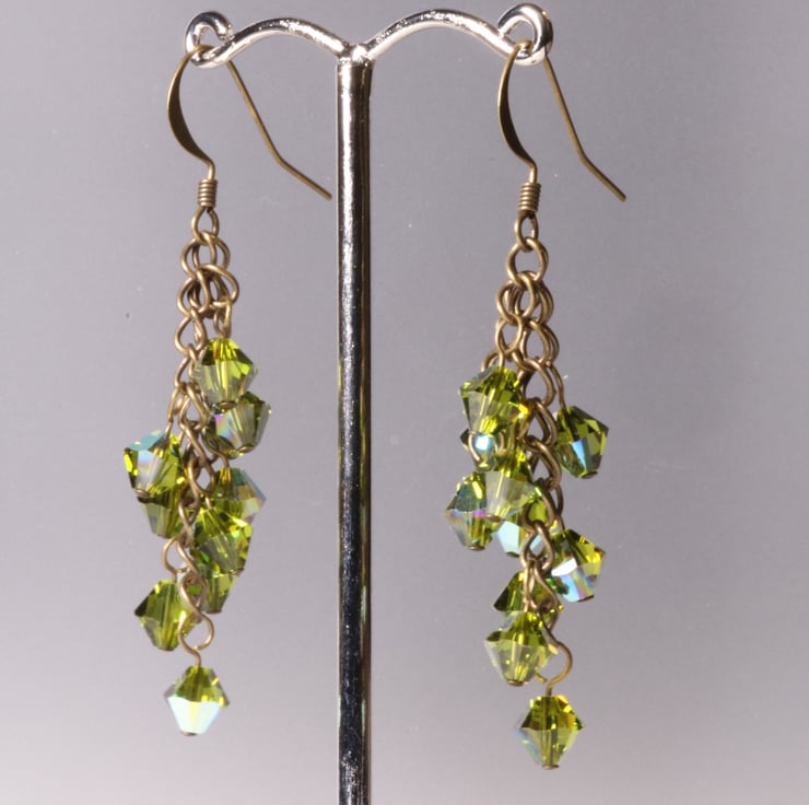 There are ten pretty olive green (olivine AB) Swarovski crystals on each of these elegant cascade earrings. The AB coating is a thin metallic coating on some of the facets which gives a mirror-like finish thus helping to make them sparkle in the light. The chain from which these earrings have been made is an antique gold colour and they have been strung on ear-wires to match.
