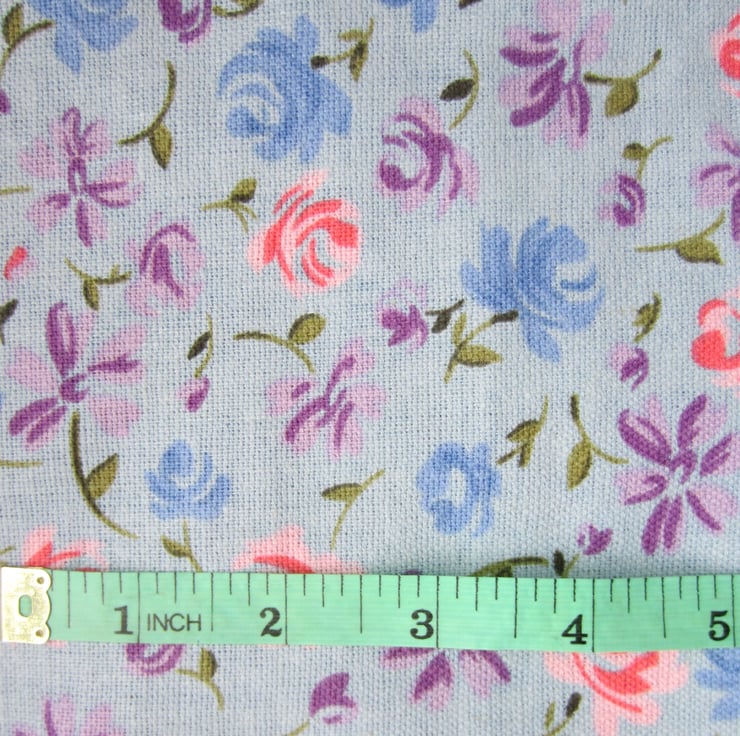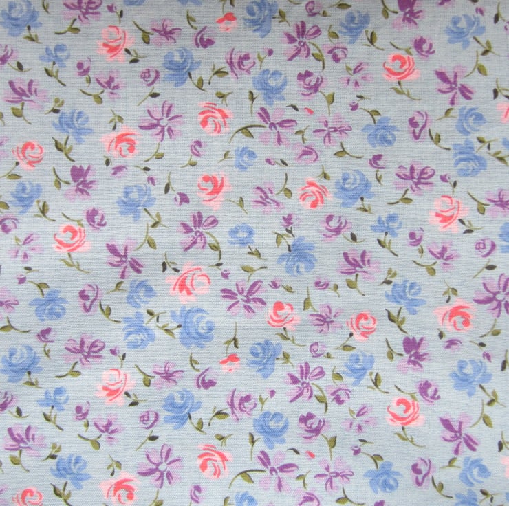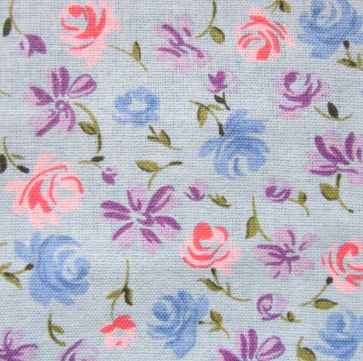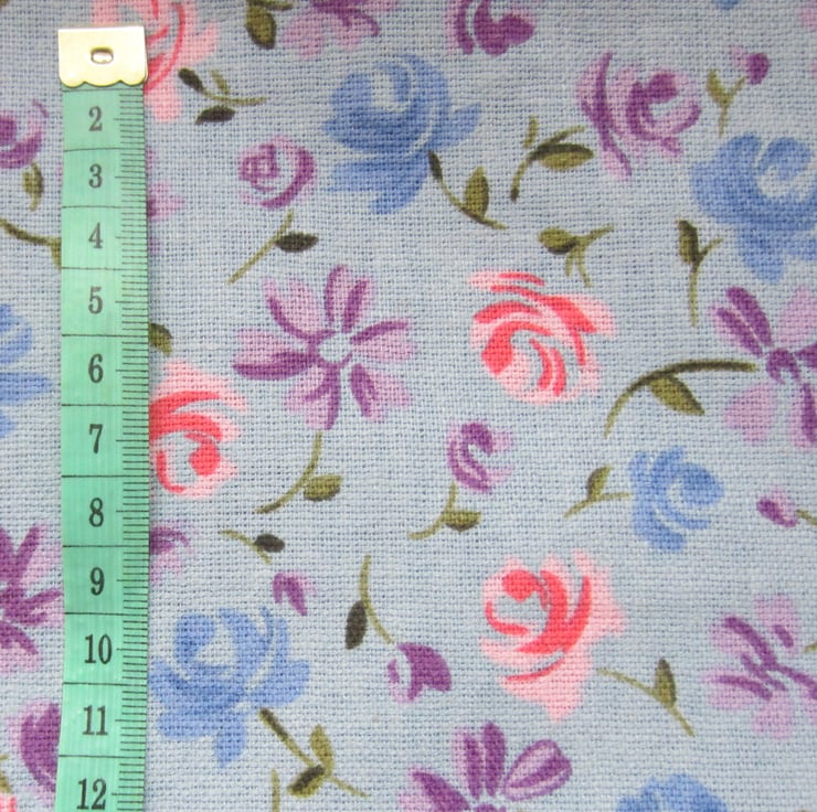 1.5 metres of a medium weight dressmaking fabric in a pretty blue, pink, lilac and green flower and leaf design on a grey-blue background. It has a soft drapey canvas type feel to it and is prone to fraying.