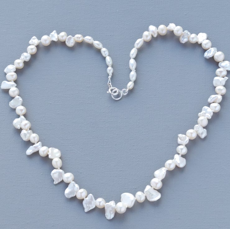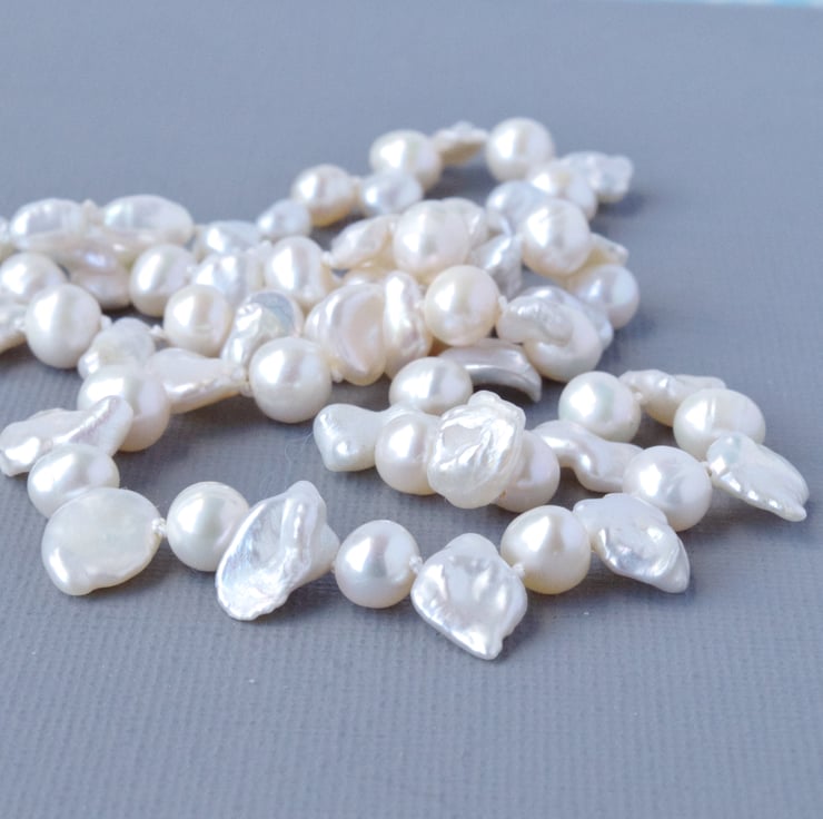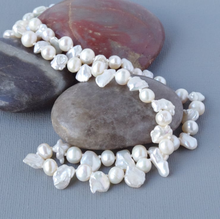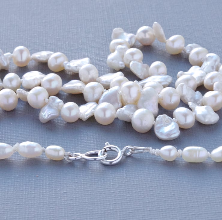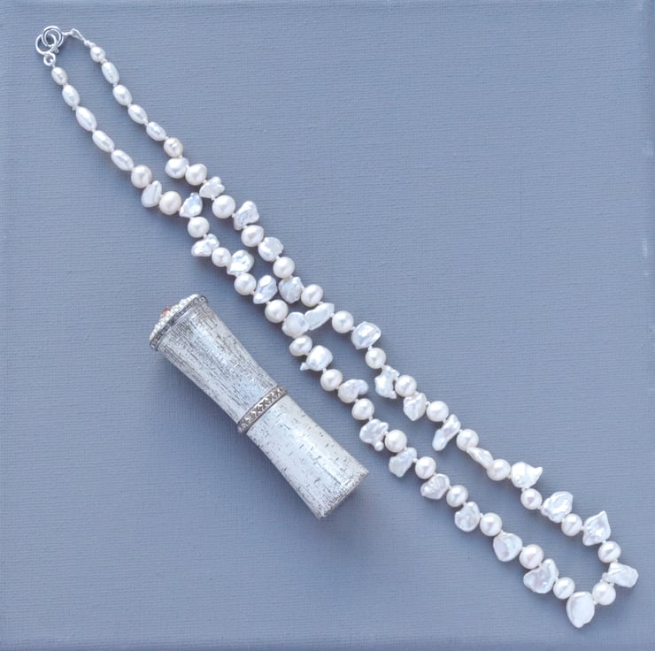 Keishi pearls are among the most glamorous of all pearls. They combine both a delicate pearl lustre and petal-like unique shapes that appear to dance as they are worn and change with the light. I have spaced these white Keishi pearls with smooth round white oval pearls to create a generous necklace, 500 mm or 19 1/2" in length. All of the pearls are excellent quality cultured freshwater pearls with a high shine and lustre. The technique I have used in this case is to knot the beads individually on pure white silk thread, leaving a knot between each bead, creating a necklace of exceptional drape which will not kink over time as necklaces beaded on wire tend to do. When wearing such rare and unique pearls, it is entirely fitting that they are mounted on silk, and fastened with a hand forged sterling silver ring, and a strong commercially produced sterling silver bolt ring fastening. These bohemian pearls are equally happy with knitwear at home, at the office or will happily accompany you on an evening out.