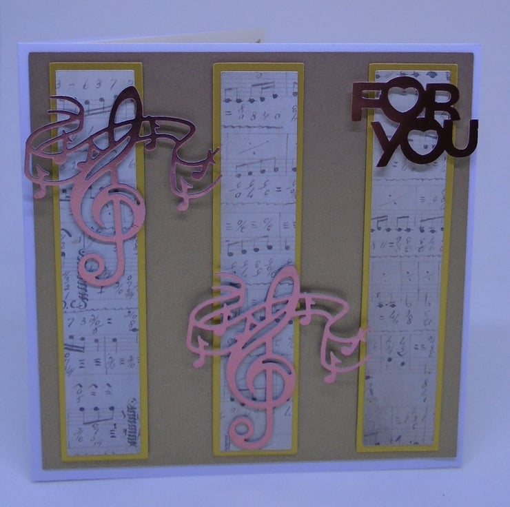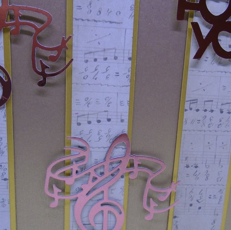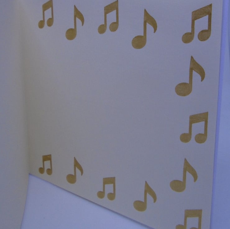 This card is 6 x 6 in size, has a white base and has a Matt and layer in Antique gold, the strips are Bright gold with a Matt and layer of sheet music, the treble clefs are hot foiled in dusky copper, the same is said for the sentiment, inside the card its lined with 100 GSM vellum laid paper with musical notes, I have done these in Gold metallic, the card apart from the music notes inside, is blank inside for your message. I will send this card out first class.