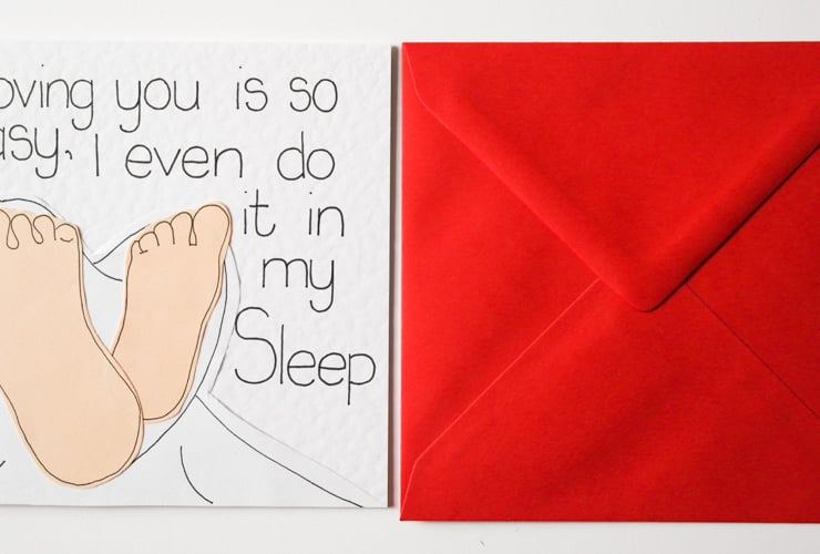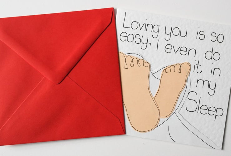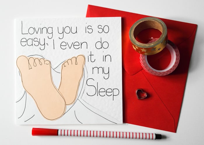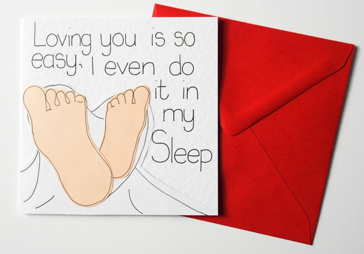 A handmade Valentine, Birthday, love or Anniversary card with the cute message " Loving you is so easy I even do it in my sleep".