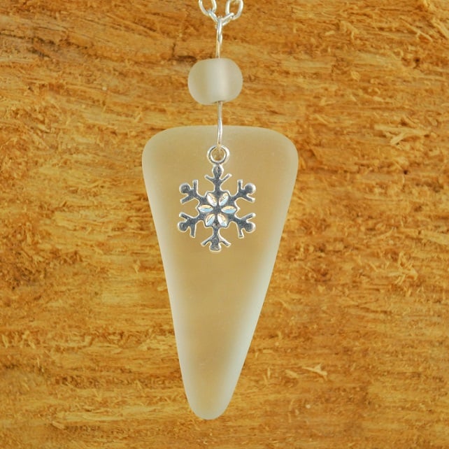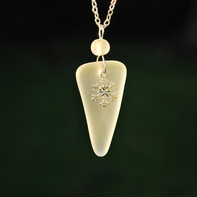 A beautiful silver snowflake charm mounted on an icicle shaped piece of sea glass. We have tumbled the sea glass so it is silky smooth. An eye-catching pendant which looks wonderful against any colour background.