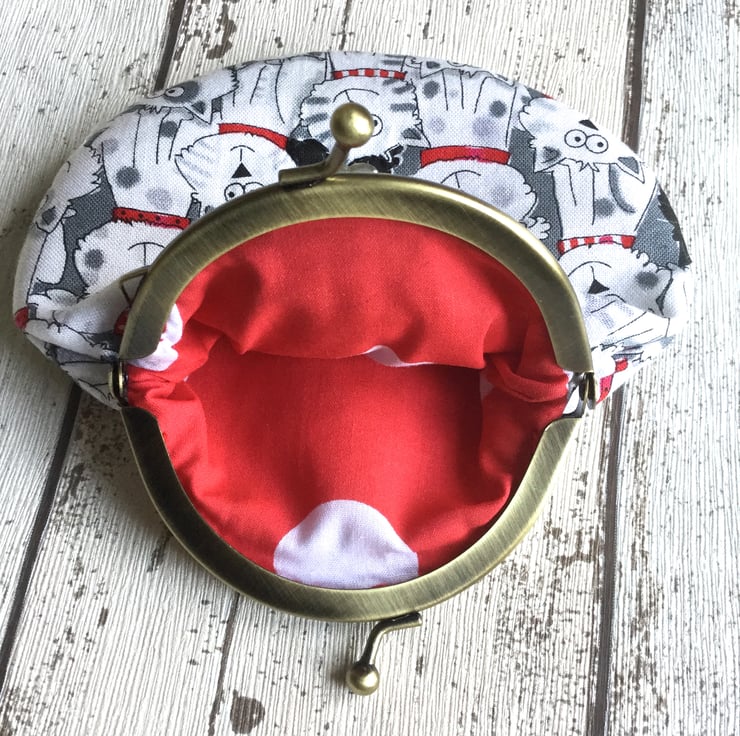 The plain antique gold coloured clasp is attached to the purse with red embroidery thread and the red lining has a large white spot design.