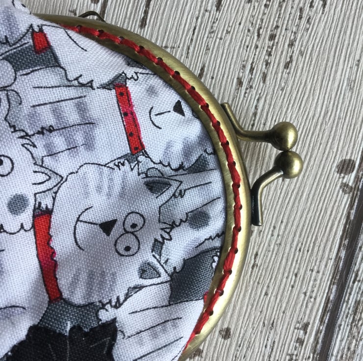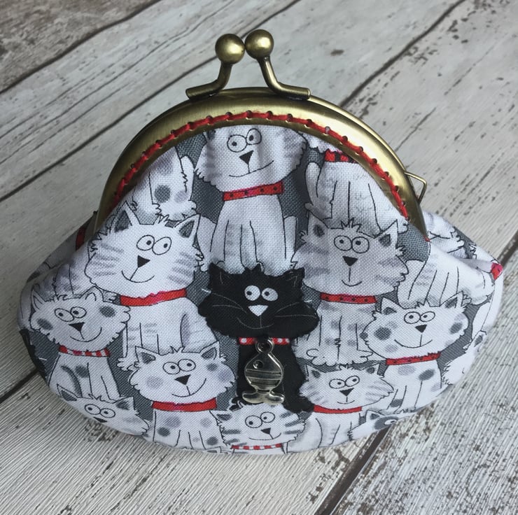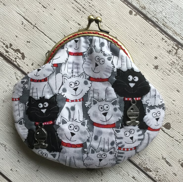 What cat lover would not be delighted with this little coin purse. The three black cats, two on one side and one on the other have their outlines quilted and a metal fish charm attached to their collars. This hard wearing cotton fabric in shades of white grey, black and red has a fleece interfacing to give it softness and structure.