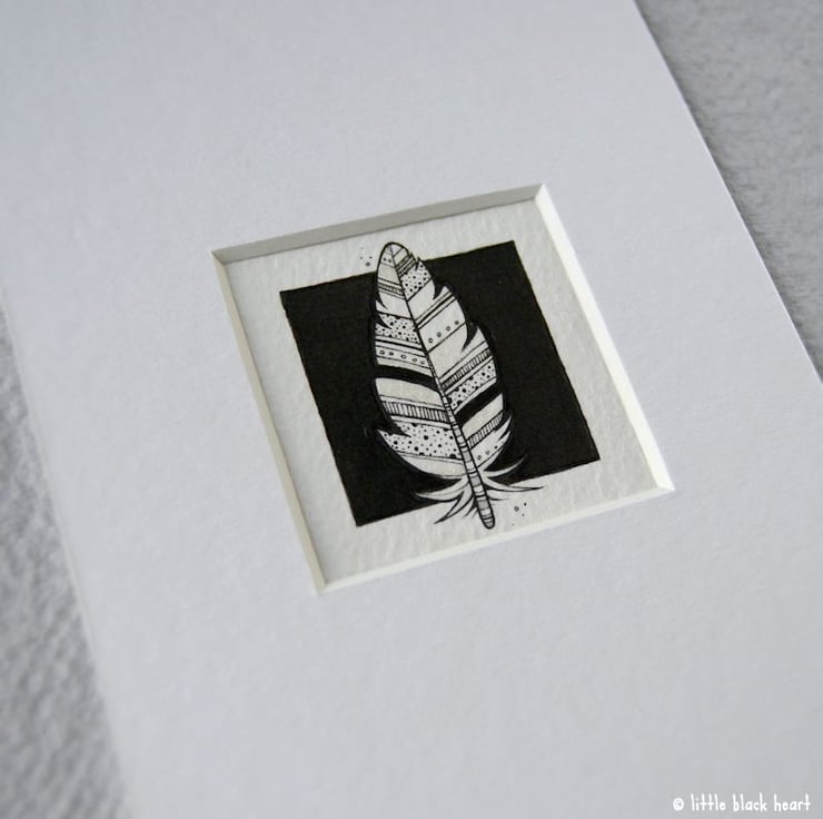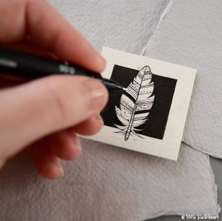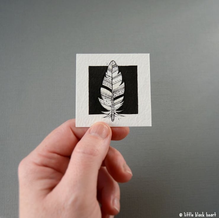 a tiny drawing of a black and white feather, with lots of detail and some shiny white gold highlights.