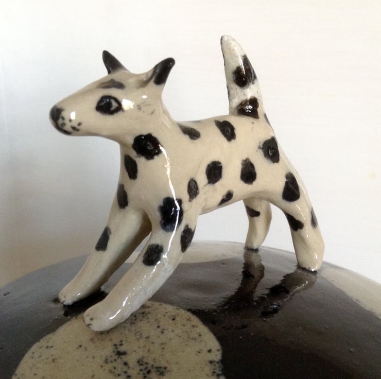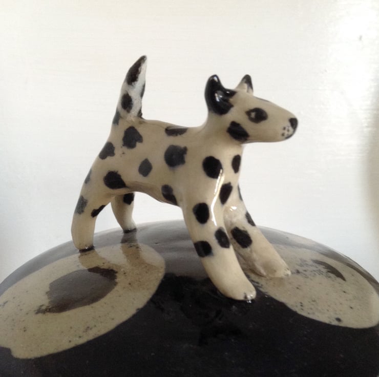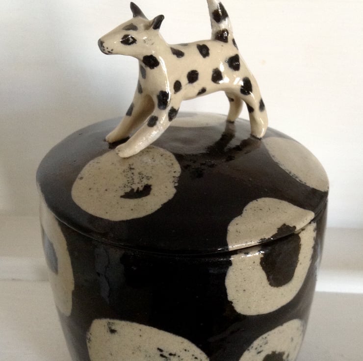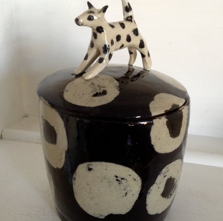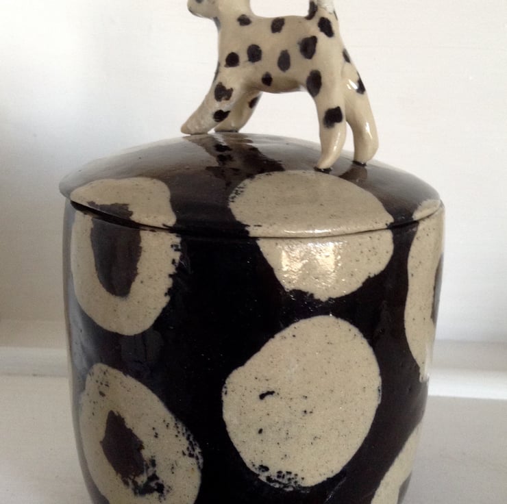 Decorative lidded storage jar with black and white decoration and a delightful hand modelled spotted dog on the lid. The jar is hand thrown and hand decorated and is made from tough high fired stoneware clay. The base is microwave and dishwasher safe. However the lid should be hand washed to protect the little dog. The jar measures 17 cms high (including the dog) and 11.5 cms wide.