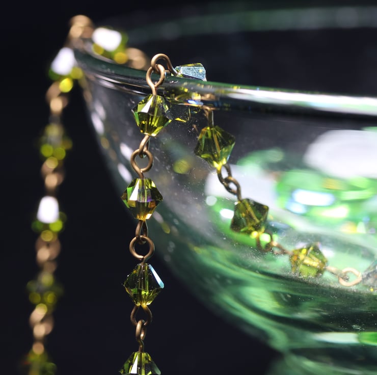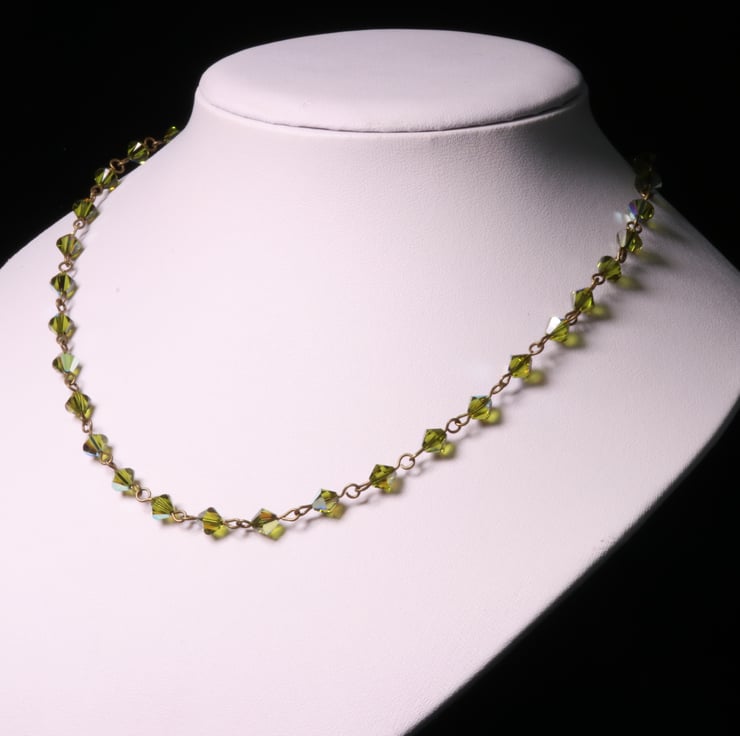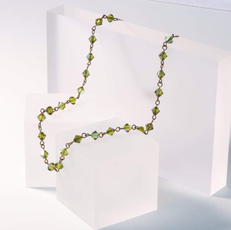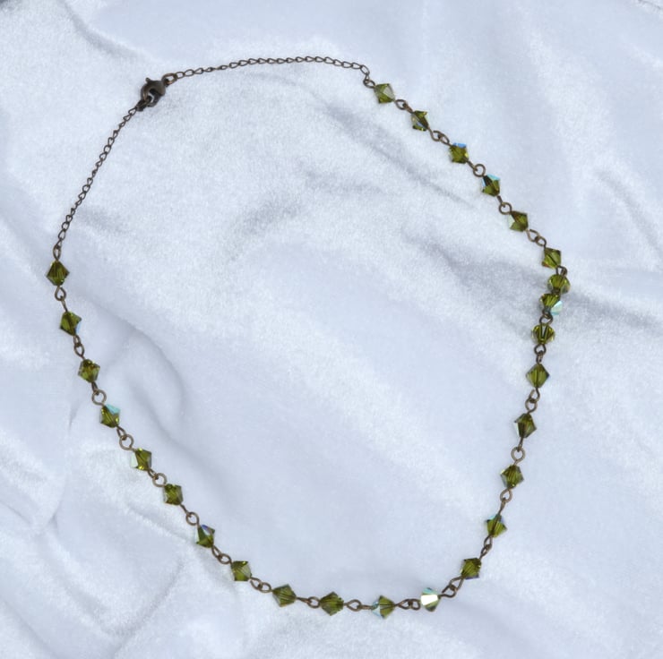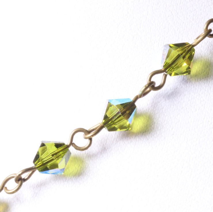 An elegant row of 26 olive green 6mm Swarovski bicone (Xilion) crystals, linked with antique gold plated pins makes a pretty necklace, finished with fine curb chain and a trigger clasp in the same colour as the pins. The Swarovski name for the colour of the crystals is Olivine AB. The AB coating is a thin metallic coating on some of the facets which gives a mirror-like finish thus helping to make them sparkle in the light.